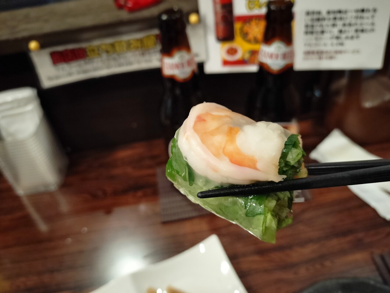 お箸で掴み そのまま食べてみると… 美味い!モチモチのライスペーパーに香草とエビ…合わないわけがありませんね