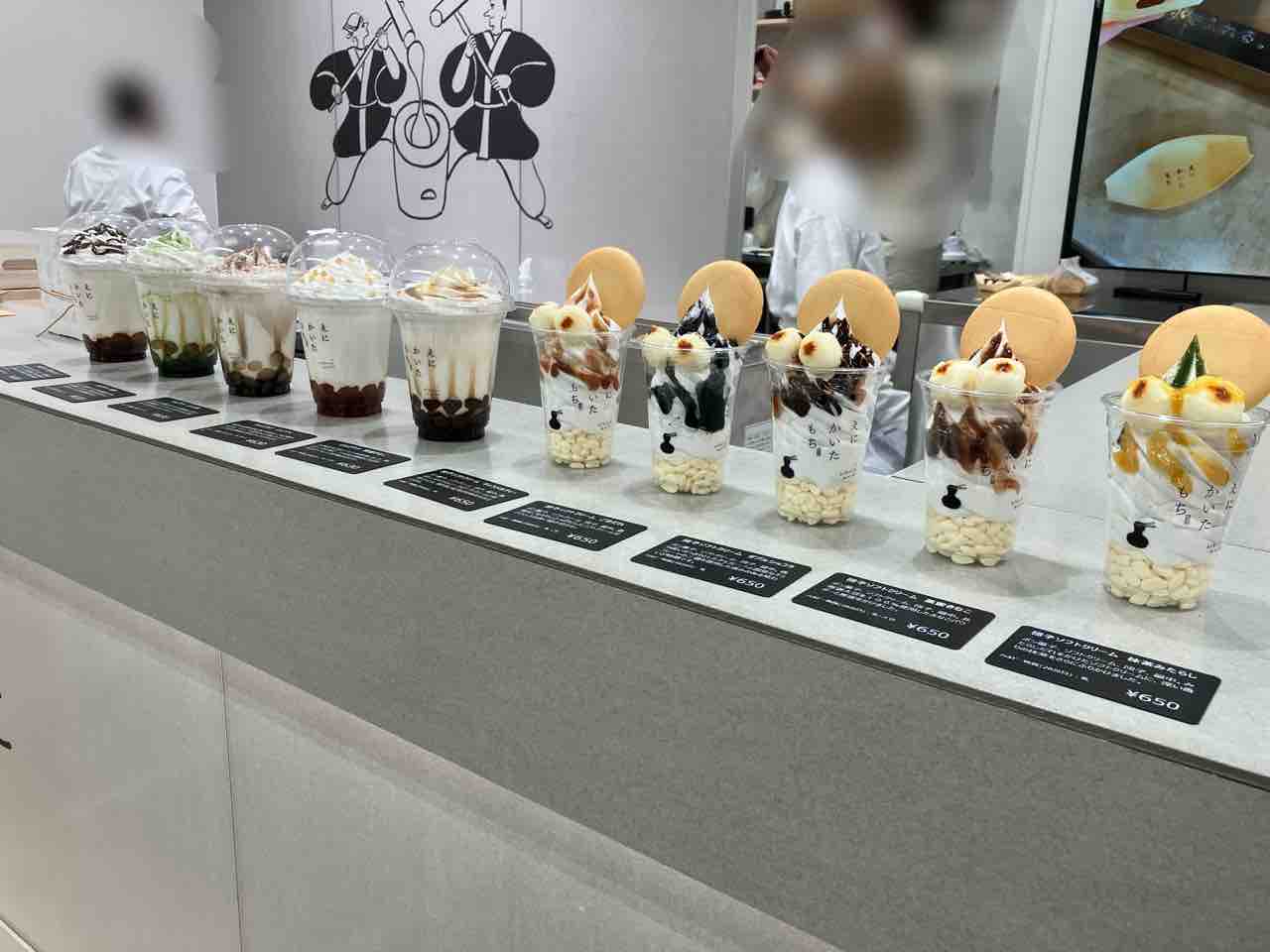 ソフトクリーム(¥350)と 黒蜜きなこラテに焼き芋 わらび餅をトッピング(¥630)し支払いレシートを受け取ると番号が表示されているので出来上がるまでカウンター横で待つこと数分