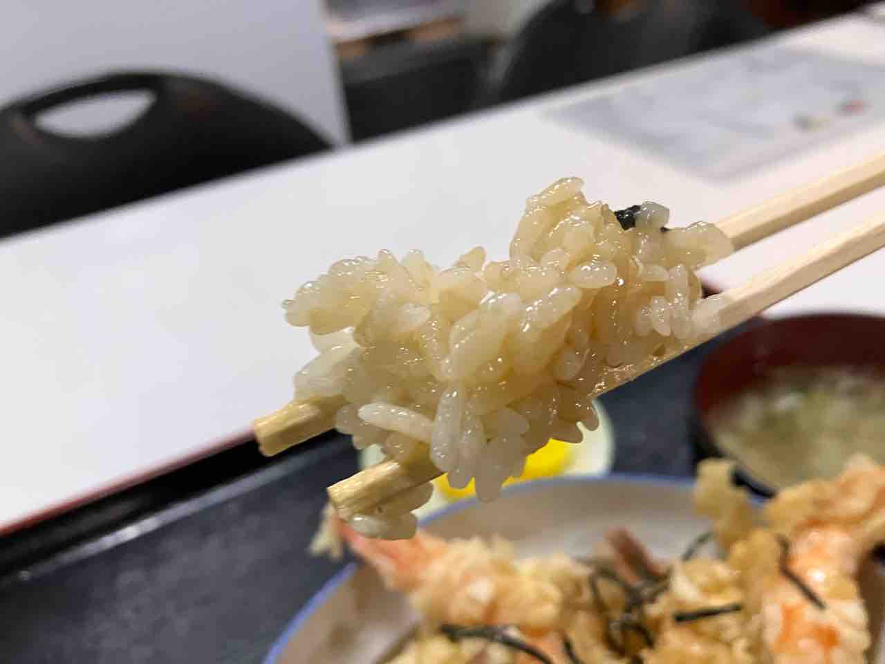 壮絶なBGMがあるかと思いきや… そんな事はなく、味噌汁これで終わりかもしれない等 仲睦まじい感じの会話が続き それから7〜8分ほど待っていると 天丼が運ばれてきました