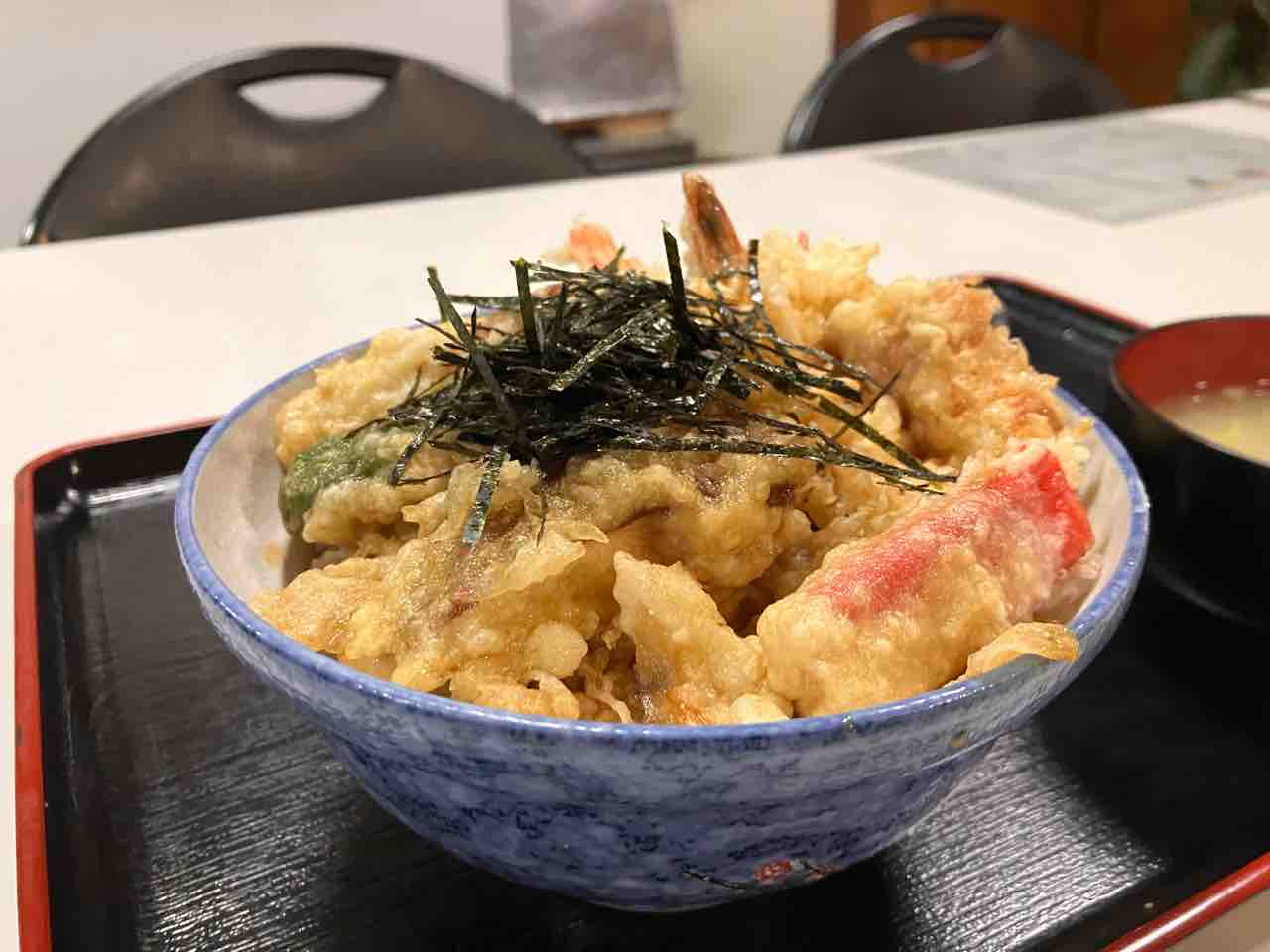 天丼(カニカマ、椎茸、ピーマン、ちくわ、エビ✖️3、玉ねぎのかき揚げ)の上に海苔