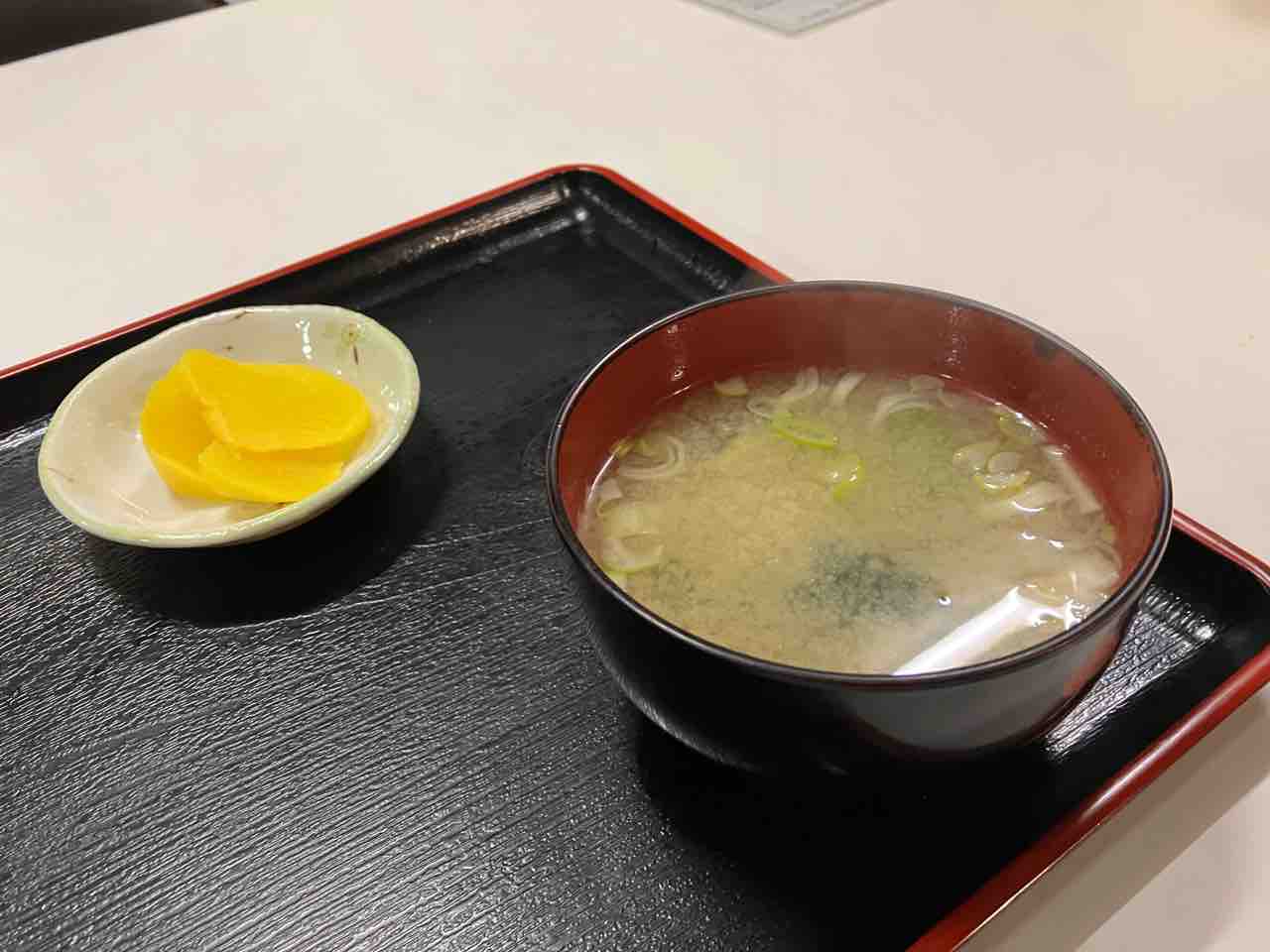 沢庵、味噌汁(ワカメ、長ネギ)
