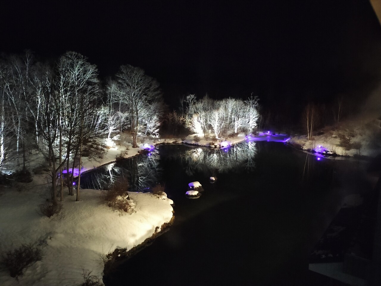 胃が満たされて部屋に戻り窓奥の開始を眺めると 夜なので駒ヶ岳は見えませんが 池がライトアップされていて とても綺麗でした