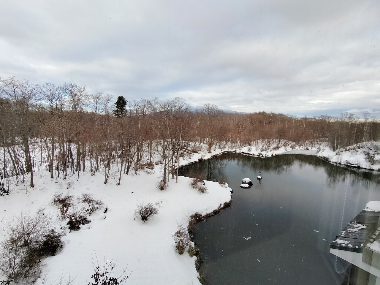 窓の奥には池と駒ヶ岳を見渡せる景観でした