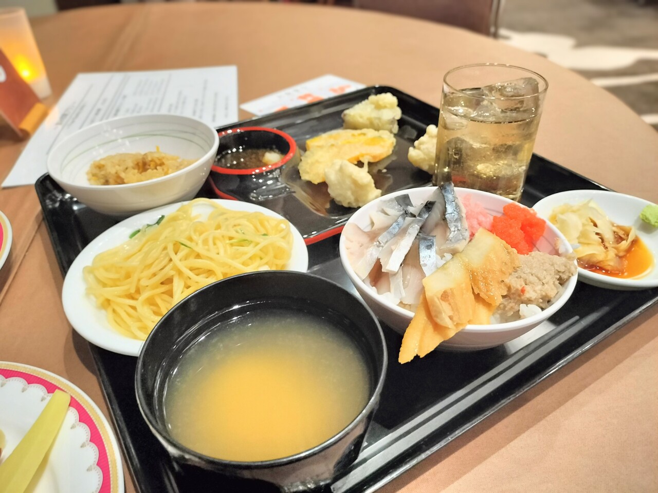 海鮮丼に味噌汁天ぷら、ペペロンチーノ、チャーハン、ジンジャーエール