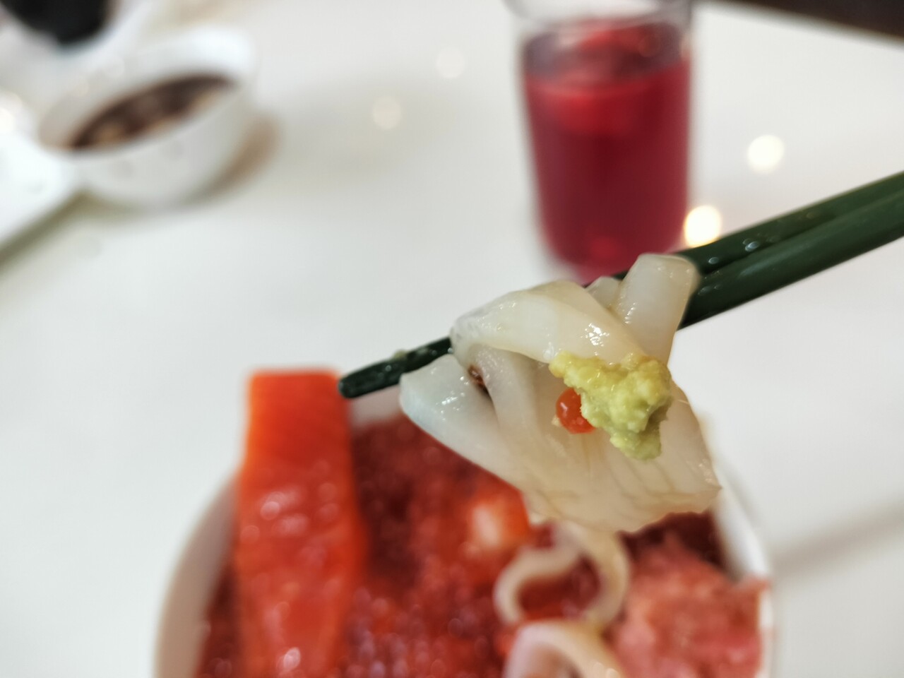 サーモン、甘エビ、イカ、ネギトロ、イクラをセルフで盛った海鮮丼