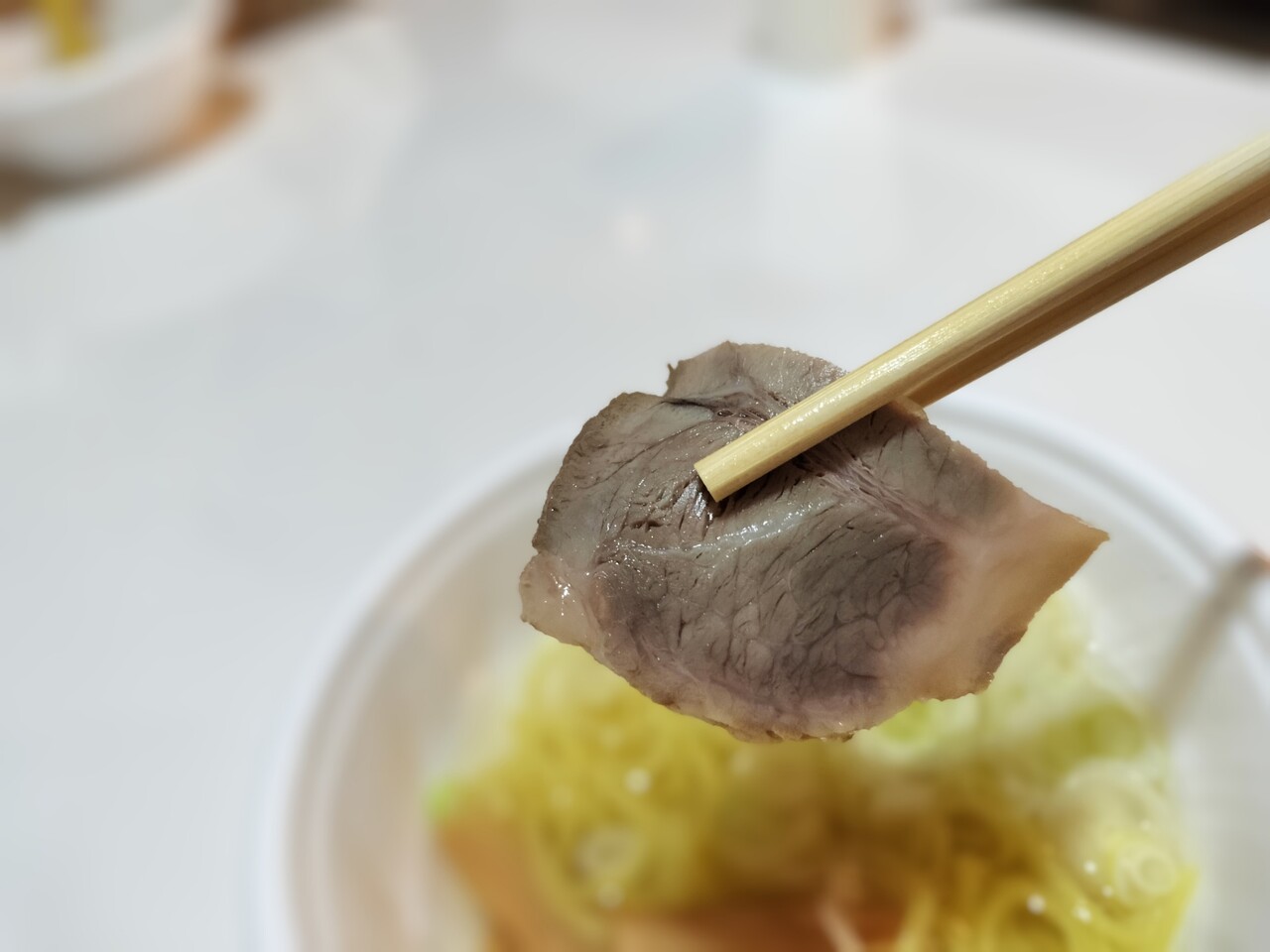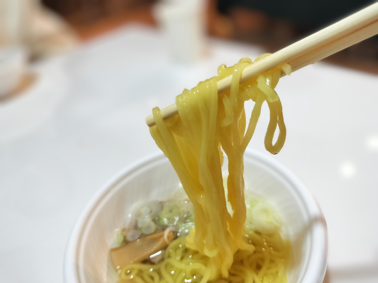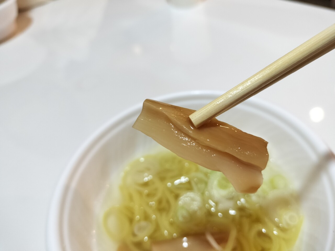スープを頂くと塩スープであっさりとして麺も啜るとスープが絡んでまぁまぁ美味い!麺は結構柔らかめ