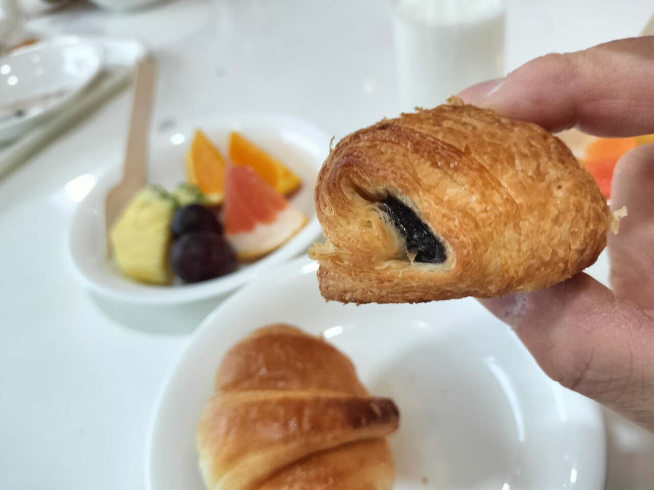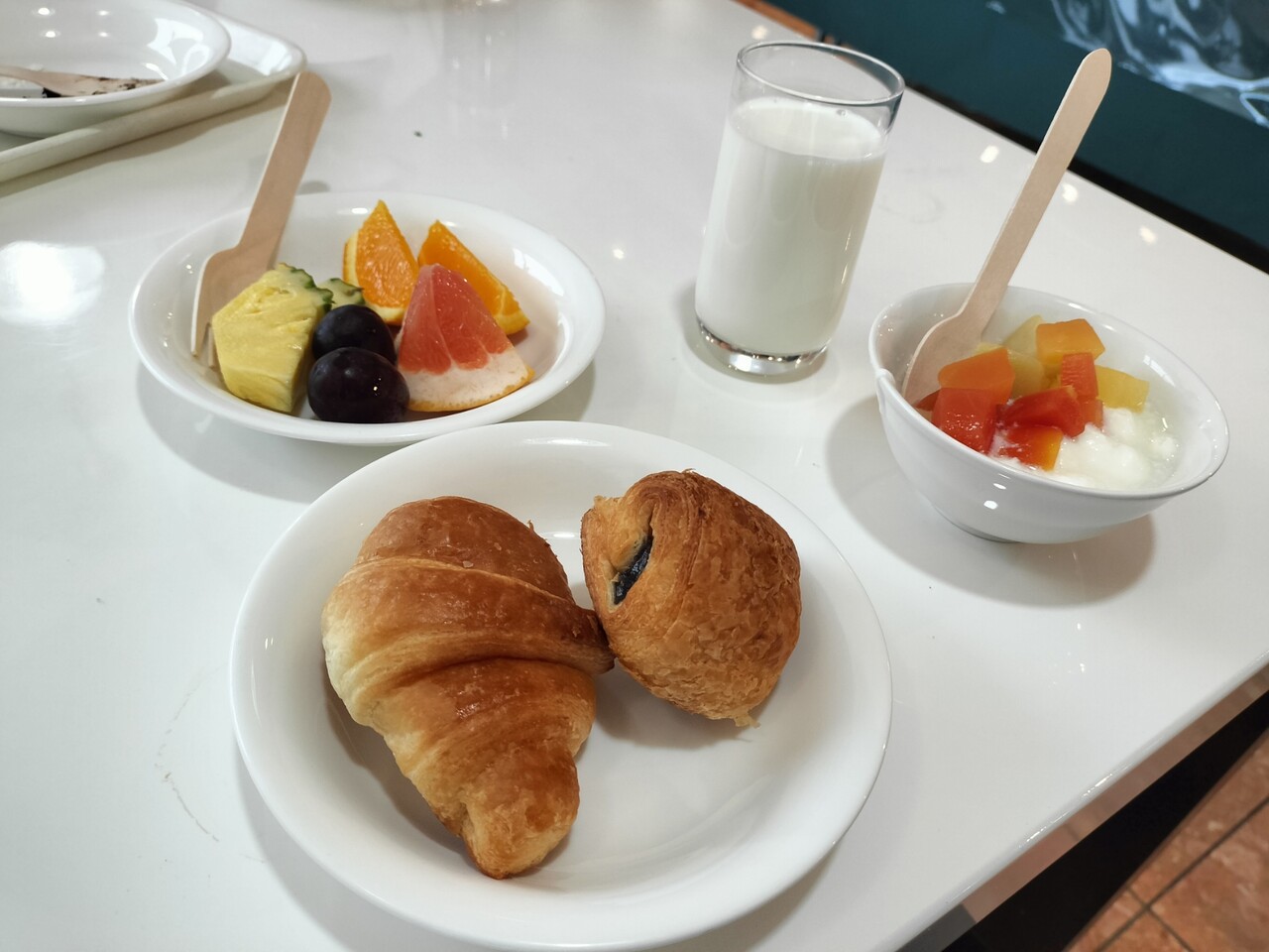 もう塩っぱい系はいいやと パンとフルーツとヨーグルトを持ってきました