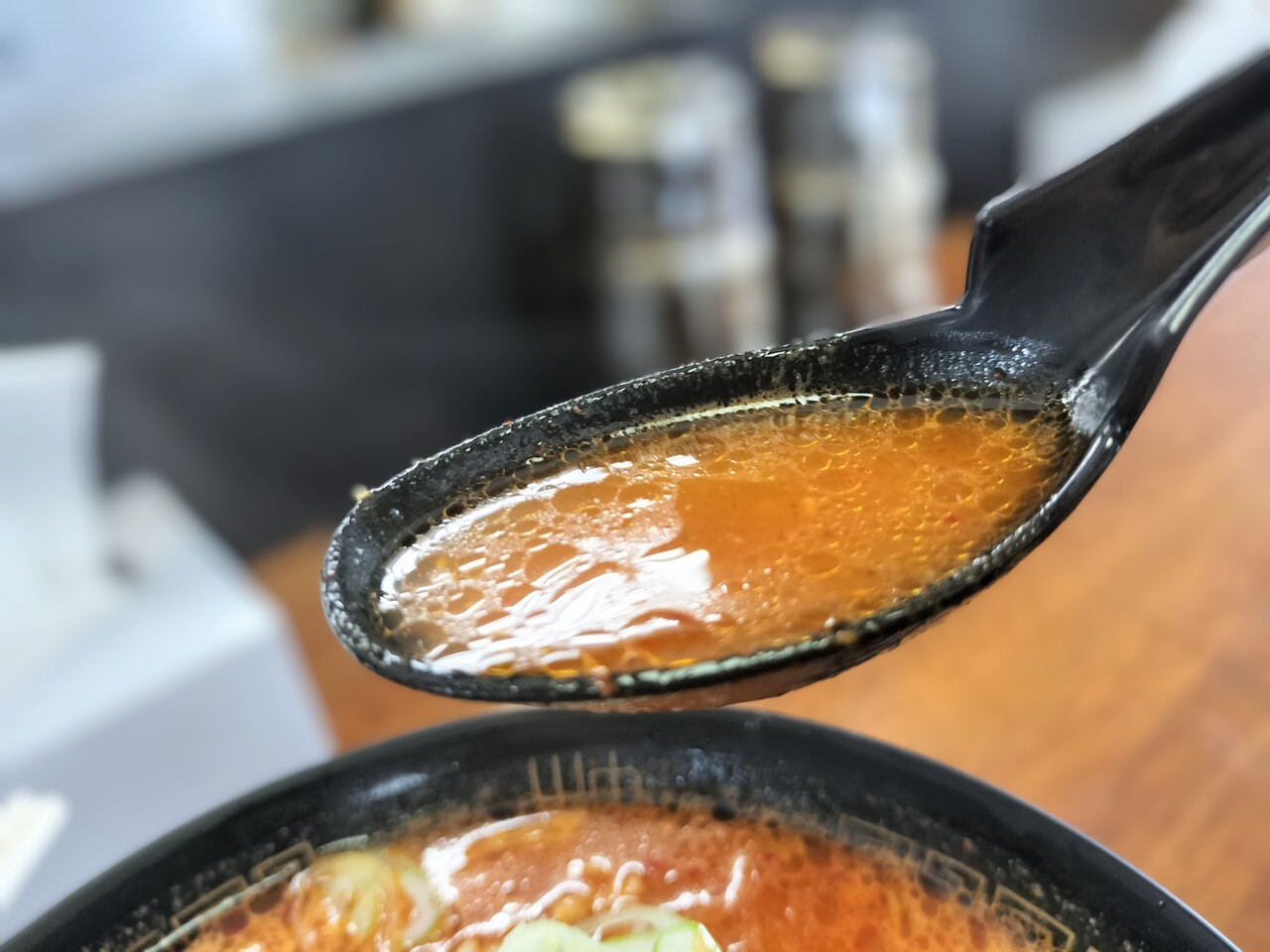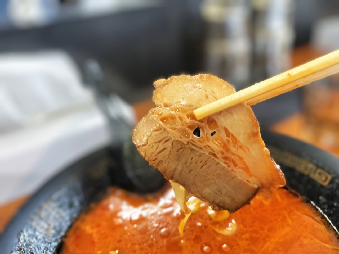 先ずはスープを頂くと軽くピリっと辛いですが 辛過ぎないスープで個人的には飲みやすくコクもあって美味い!