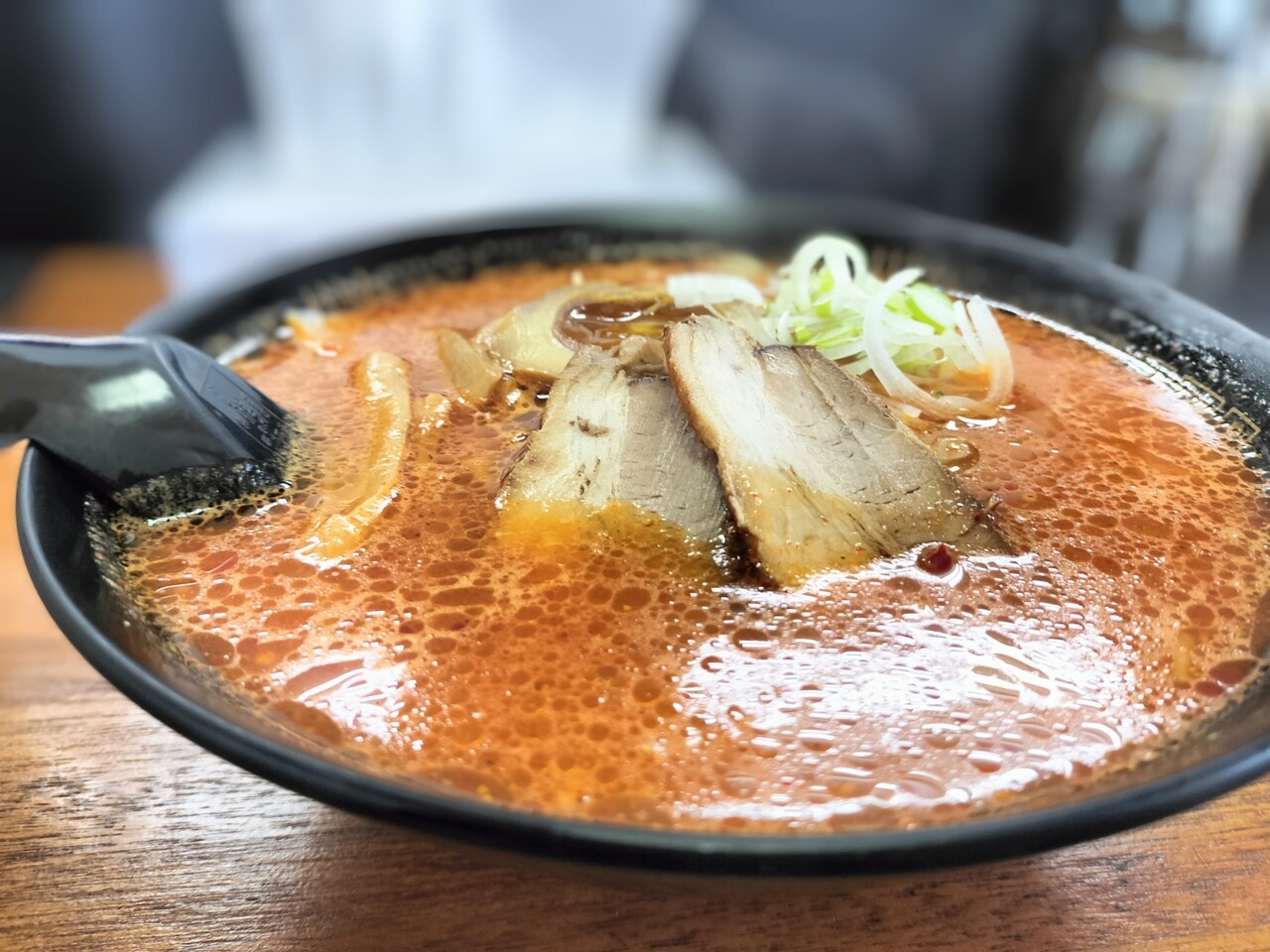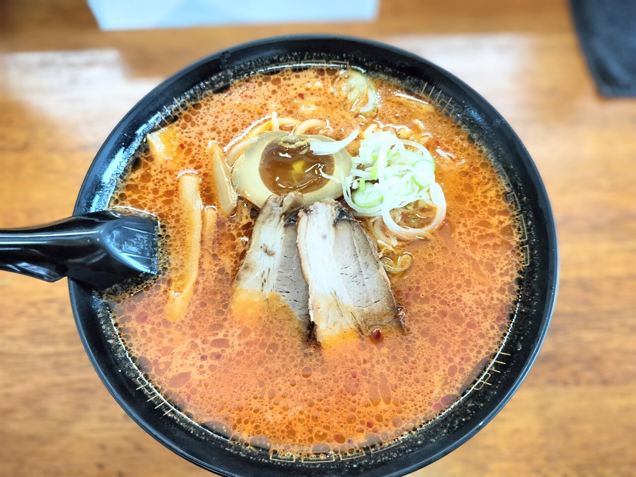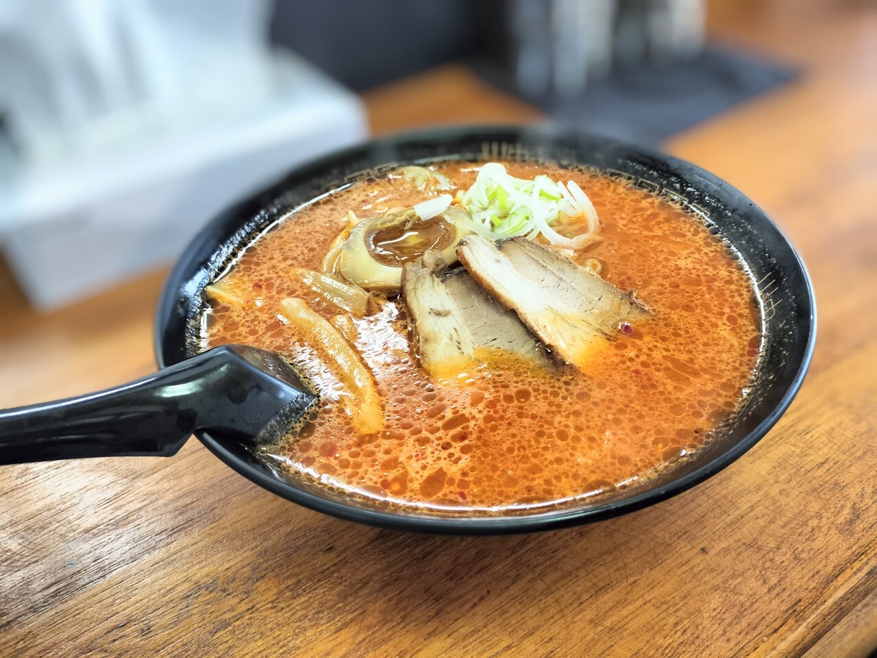 チャーシュー、メンマ、もやし、味玉、長ネギが真っ赤なスープの上に浮かんでおり