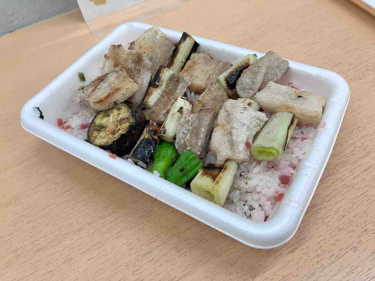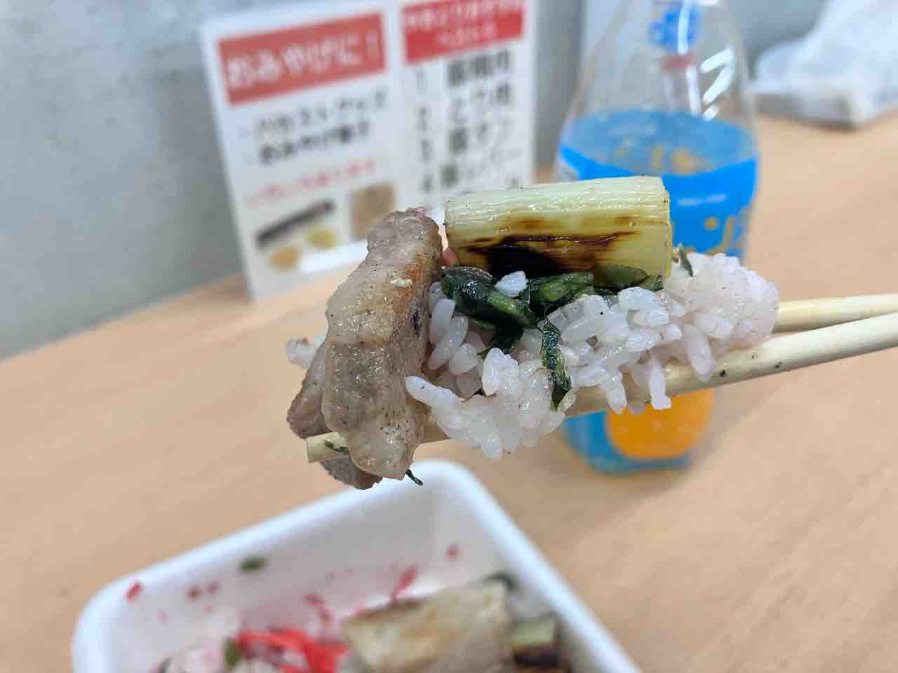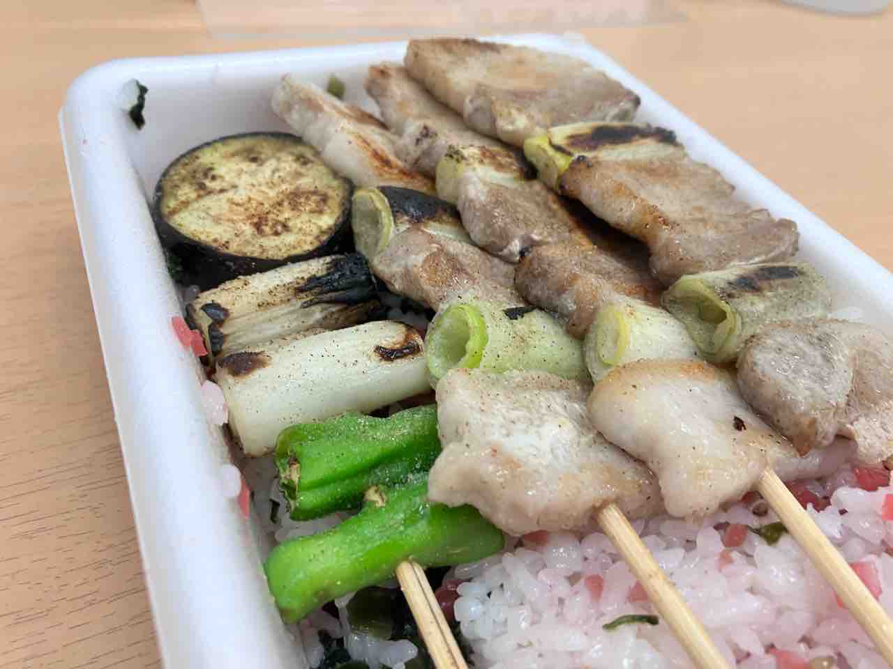 蓋をパッカーンと開けると 豚バラ肉とネギ串3本、他に茄子、長ネギ、ししとうの野菜串が1本の内容で その下には うめ野沢菜ごはんが敷き詰められております
