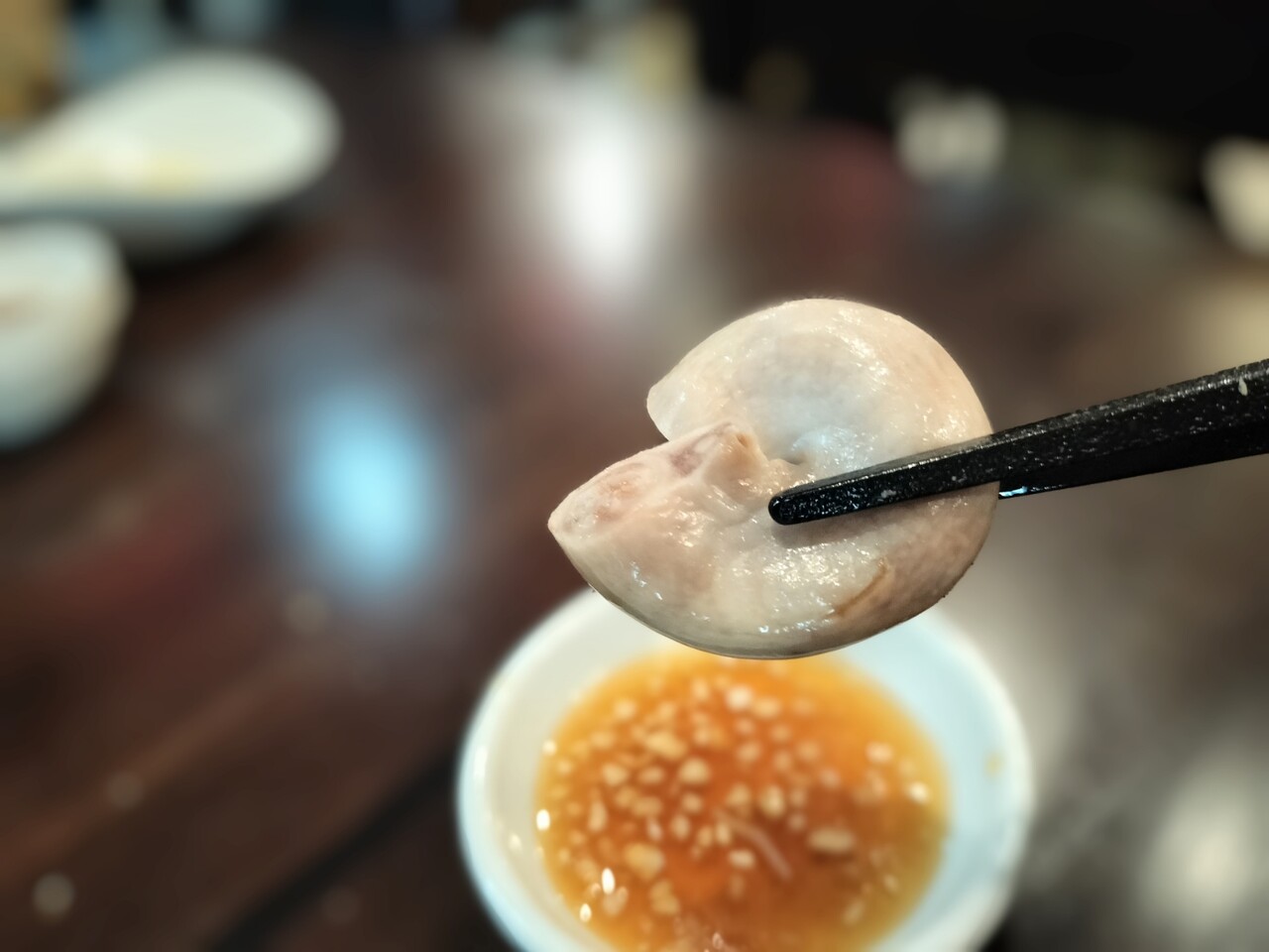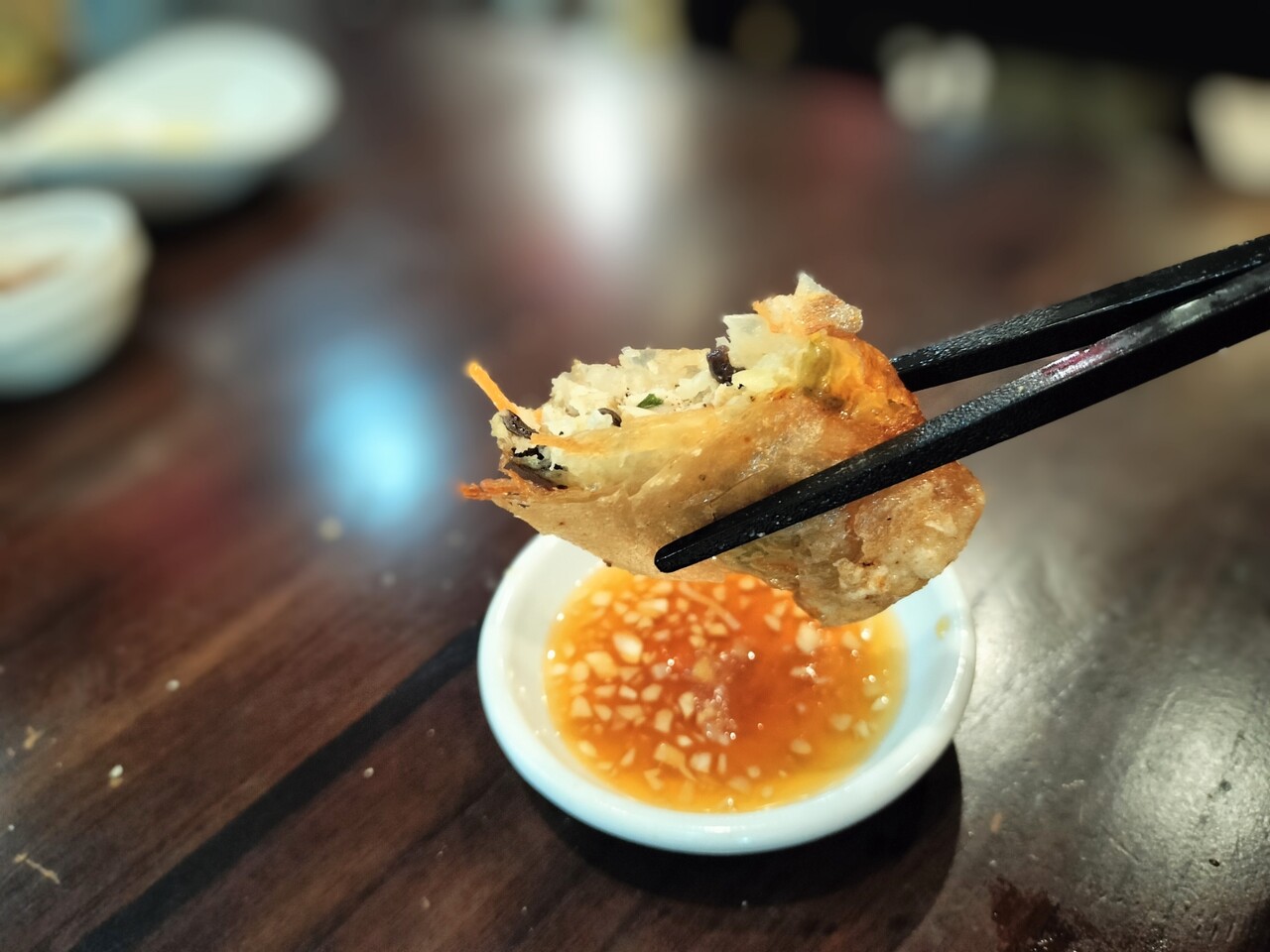 チリソースを軽くディップして口を大きく開けてガブりと食べると ソースの程よい辛さと中の具材のボリュームに圧倒され これバリバリ美味い!そして結構顎が疲れるかも笑