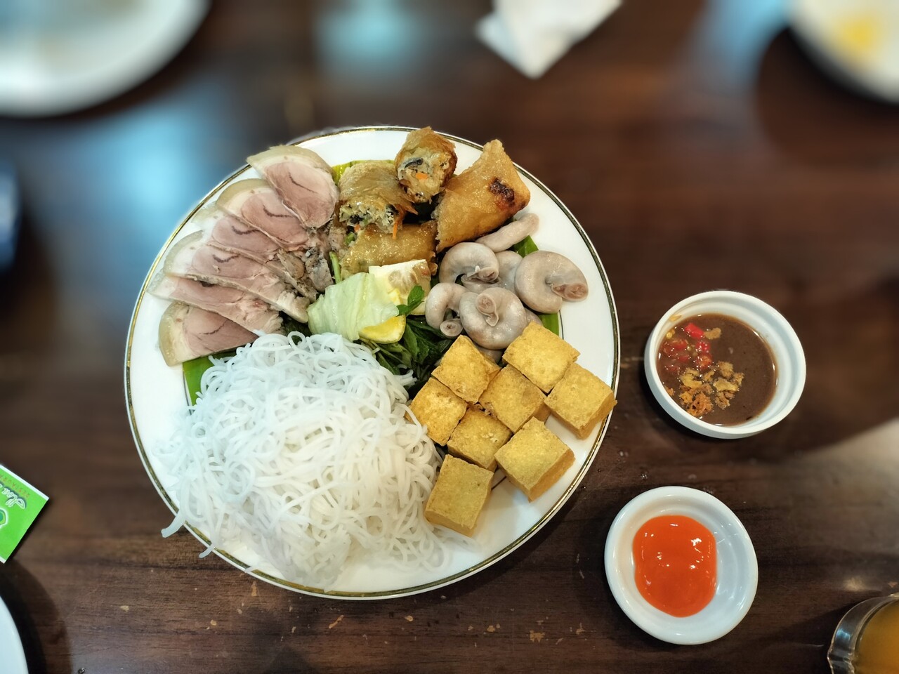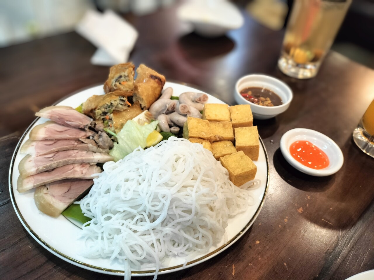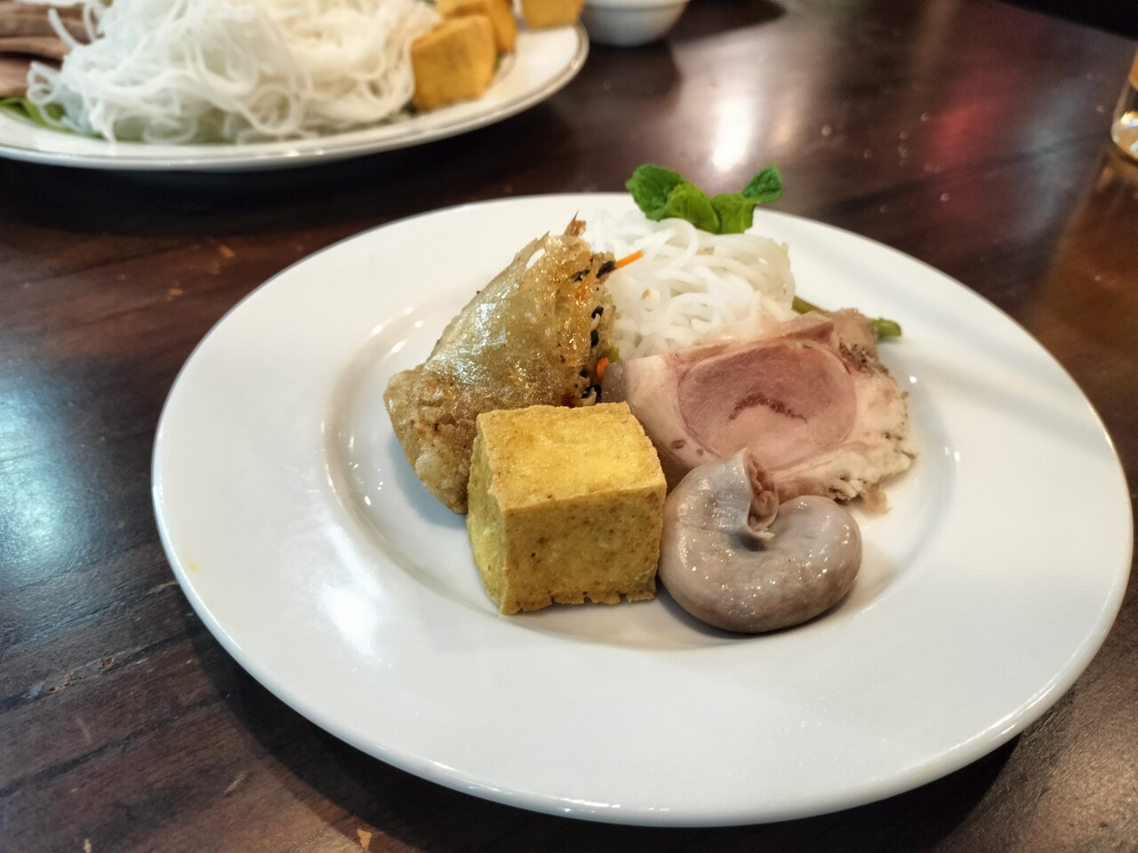 豚肉、揚げ豆腐、豚モツ、揚春巻、ブン、ミント?な内容でタレもついてきます。