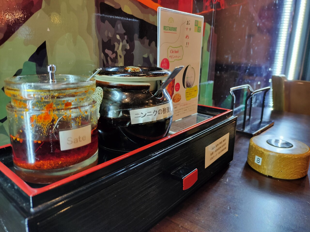 テーブル上にある辛そうな調味料を眺めていると