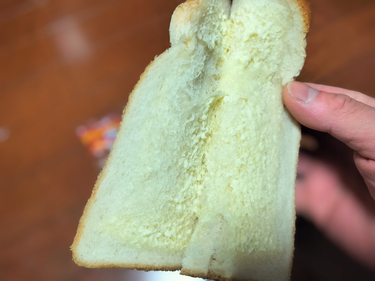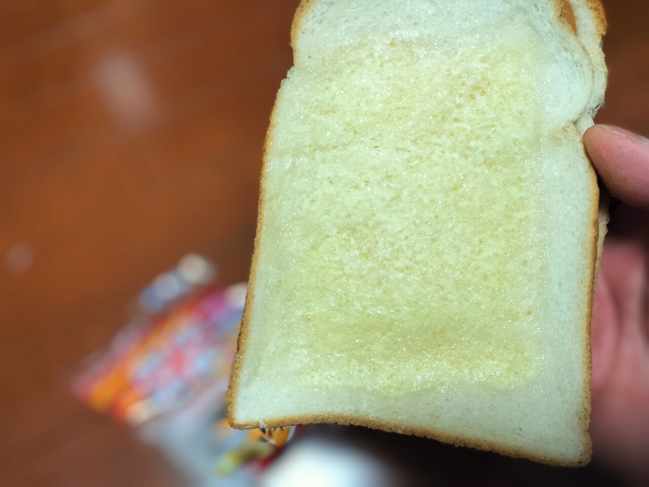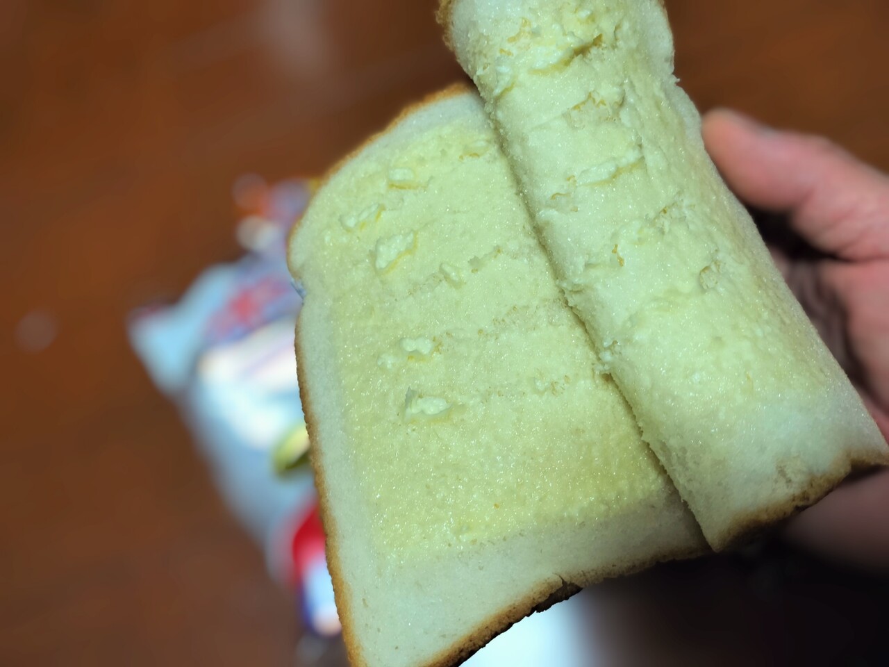 中身を見てみると通常のイギリストーストよりも更にマシマシにマーガリン&グラニュー糖が多く塗られている感じがする…
