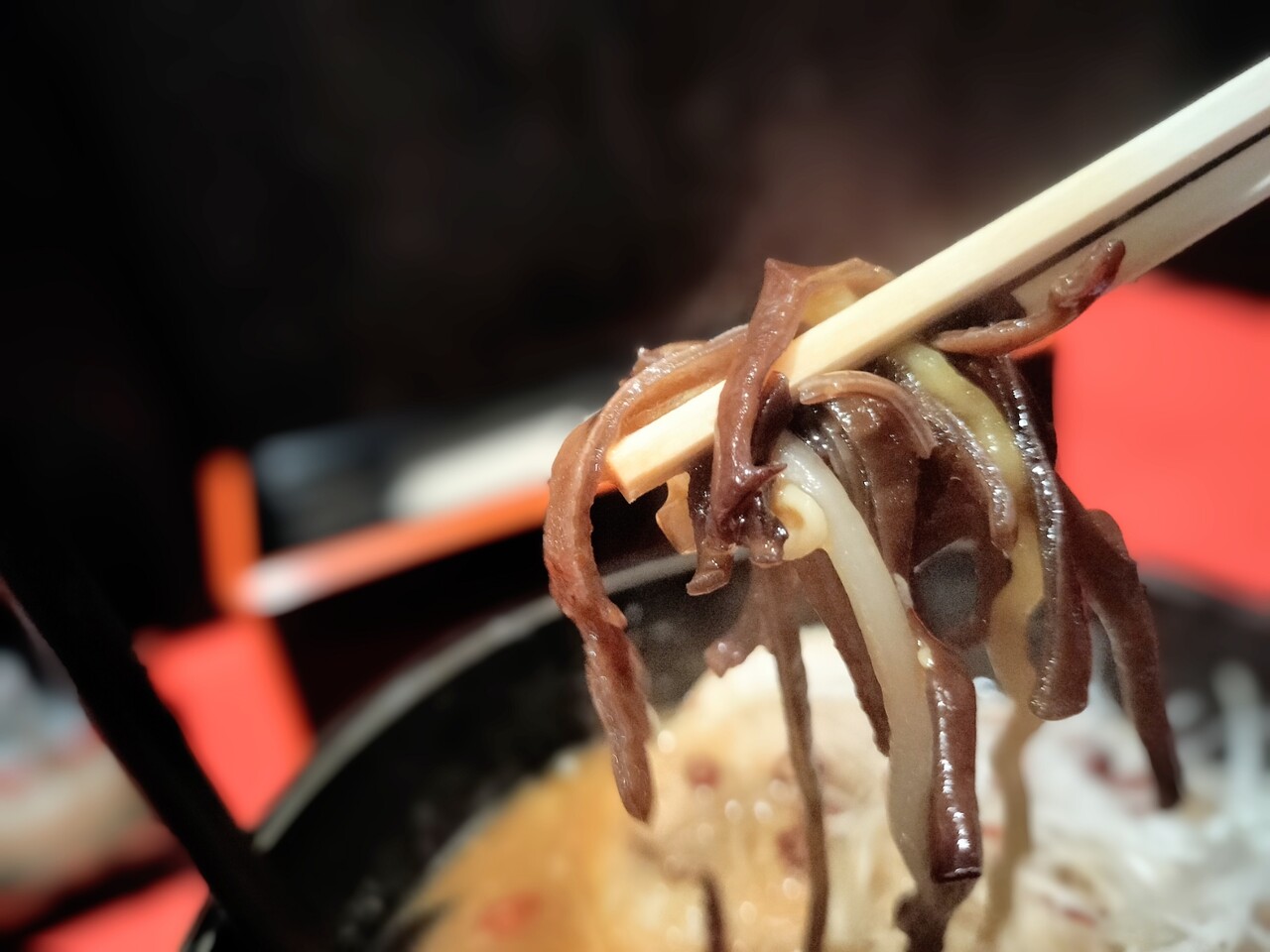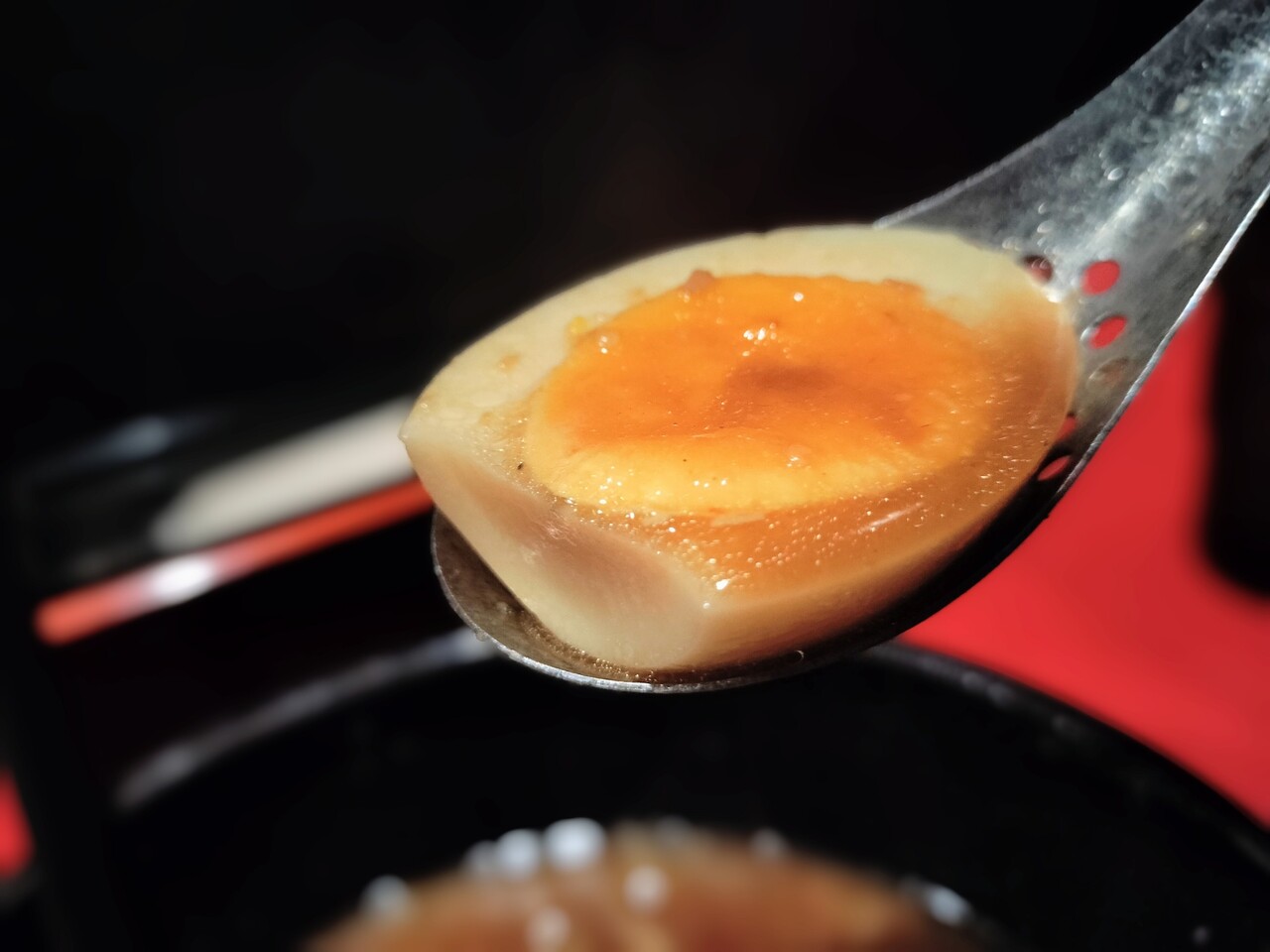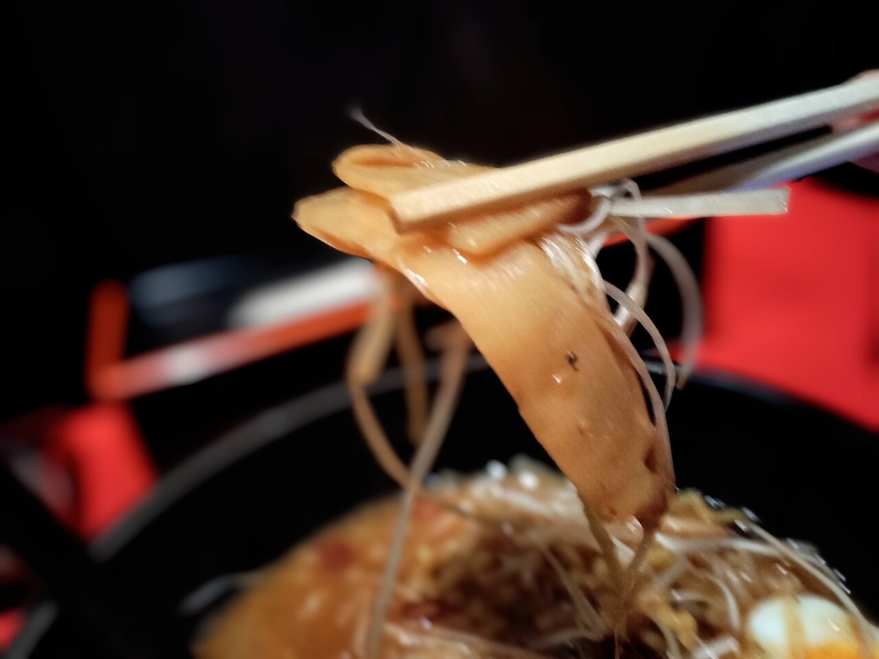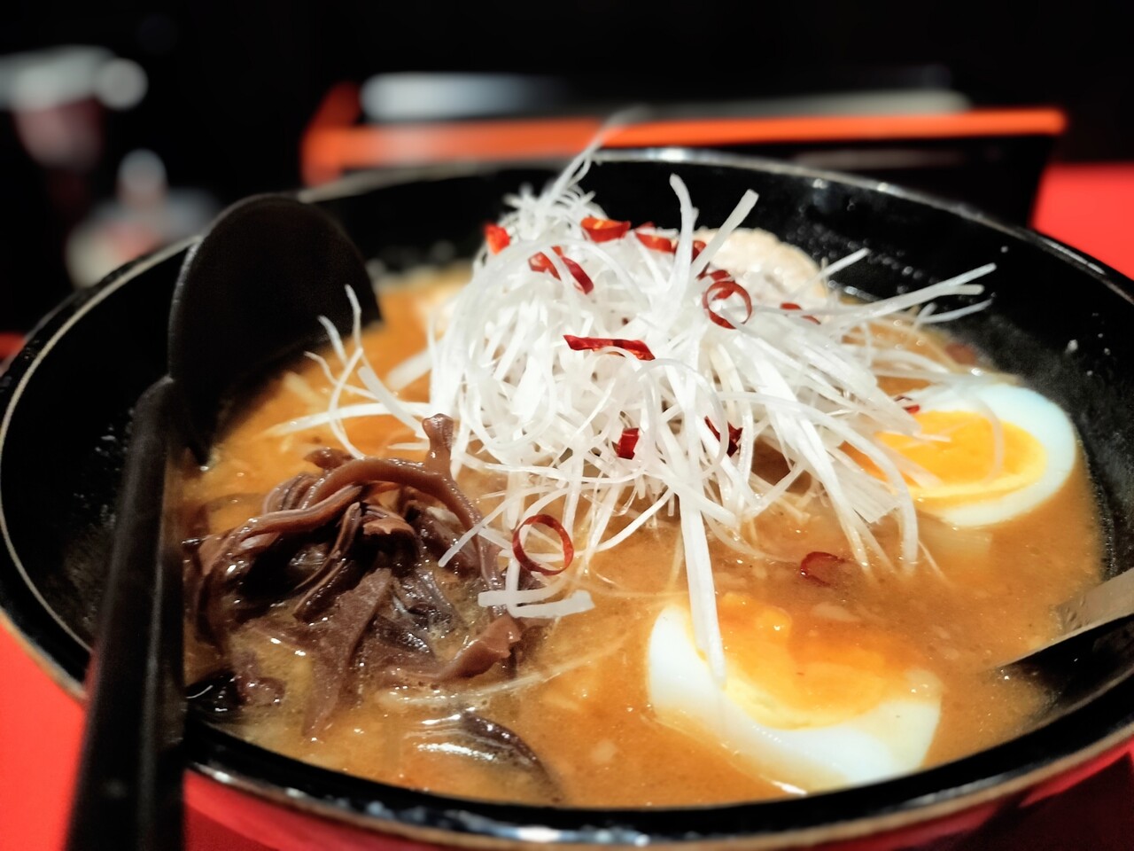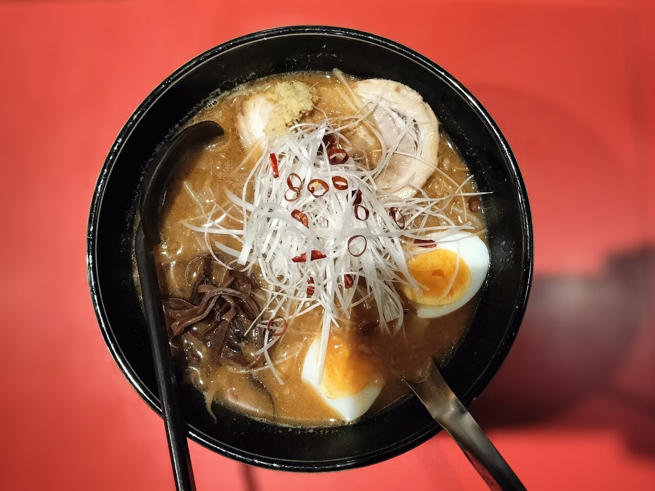 濃厚そうなスープに白髪ネギ、キクラゲ、もやし、長ネギ、メンマ、チャーシュー、ゆで卵、鷹の爪、おろしニンニクがスープの上にぷかぷかと浮いておりました