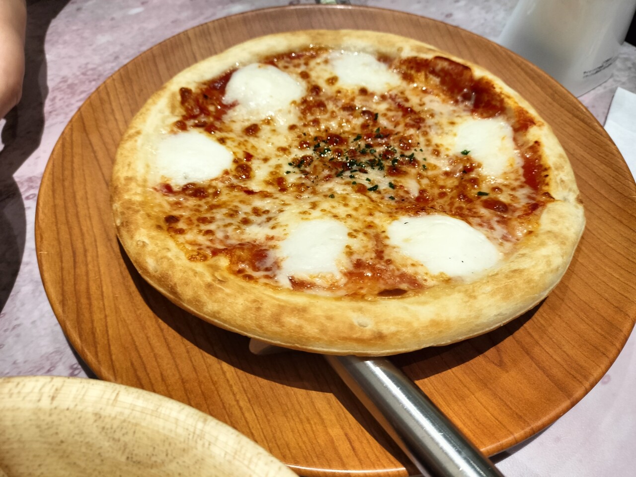 列はなく直ぐ入店でき席に案内され早速スマホでオーダーしていきます。バッファローモッツァレラのマルゲリータピザ(¥400)