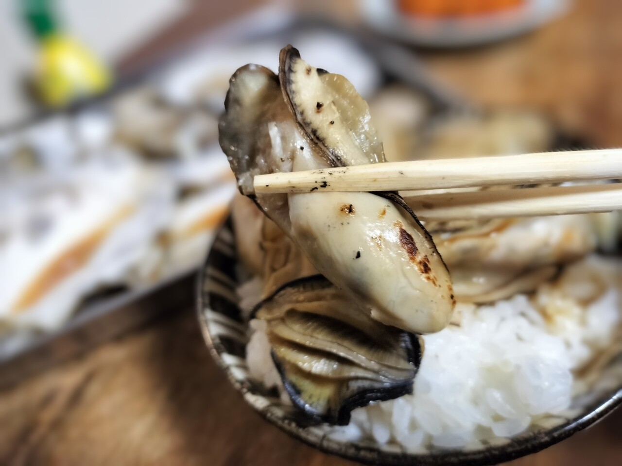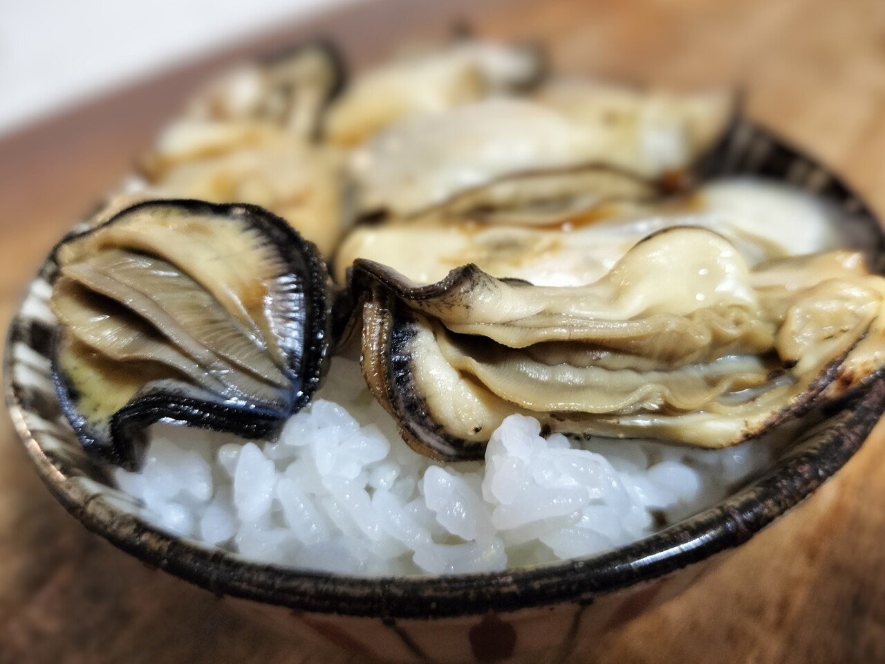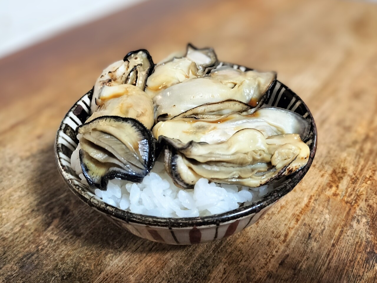 剥き身はレンチンして ちょっとバーナーで炙ってご飯の上に乗せて甘いタレを掛けて牡蠣ご飯を作ります