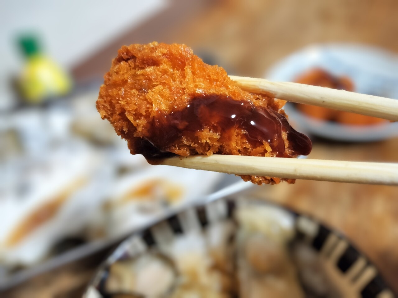 そして牡蠣フライはソースでパクリ… 噛み締めると牡蠣の旨みが口の中に広がり堪らない