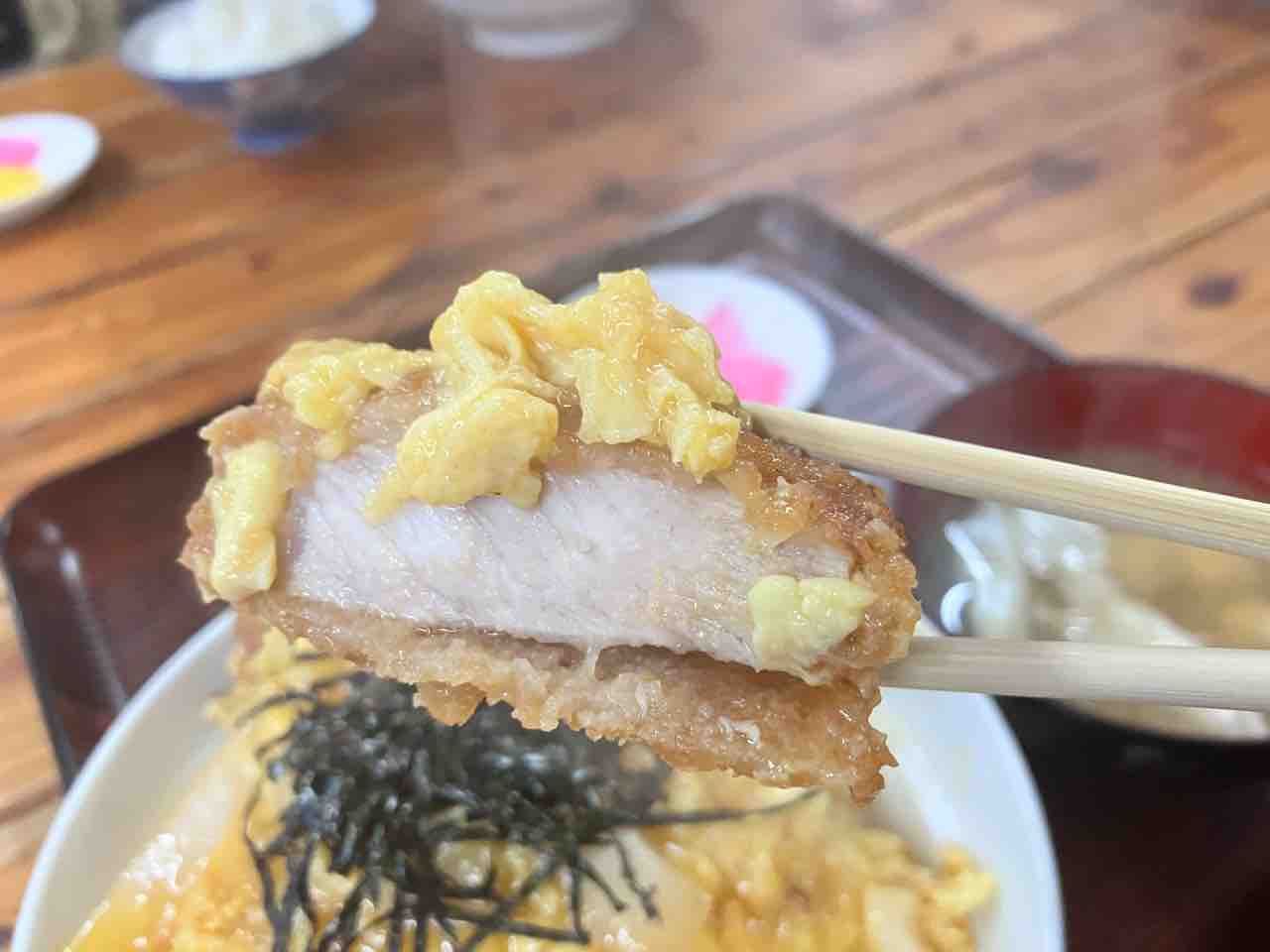 先ずは 豚カツを掴んでみると… 厚い!ロースカツが かなりの厚みです!食べると柔らかさと程よい弾力のバランスがよく 卵とじが結構甘めな味わいで これは好みのカツ丼です!美味い!