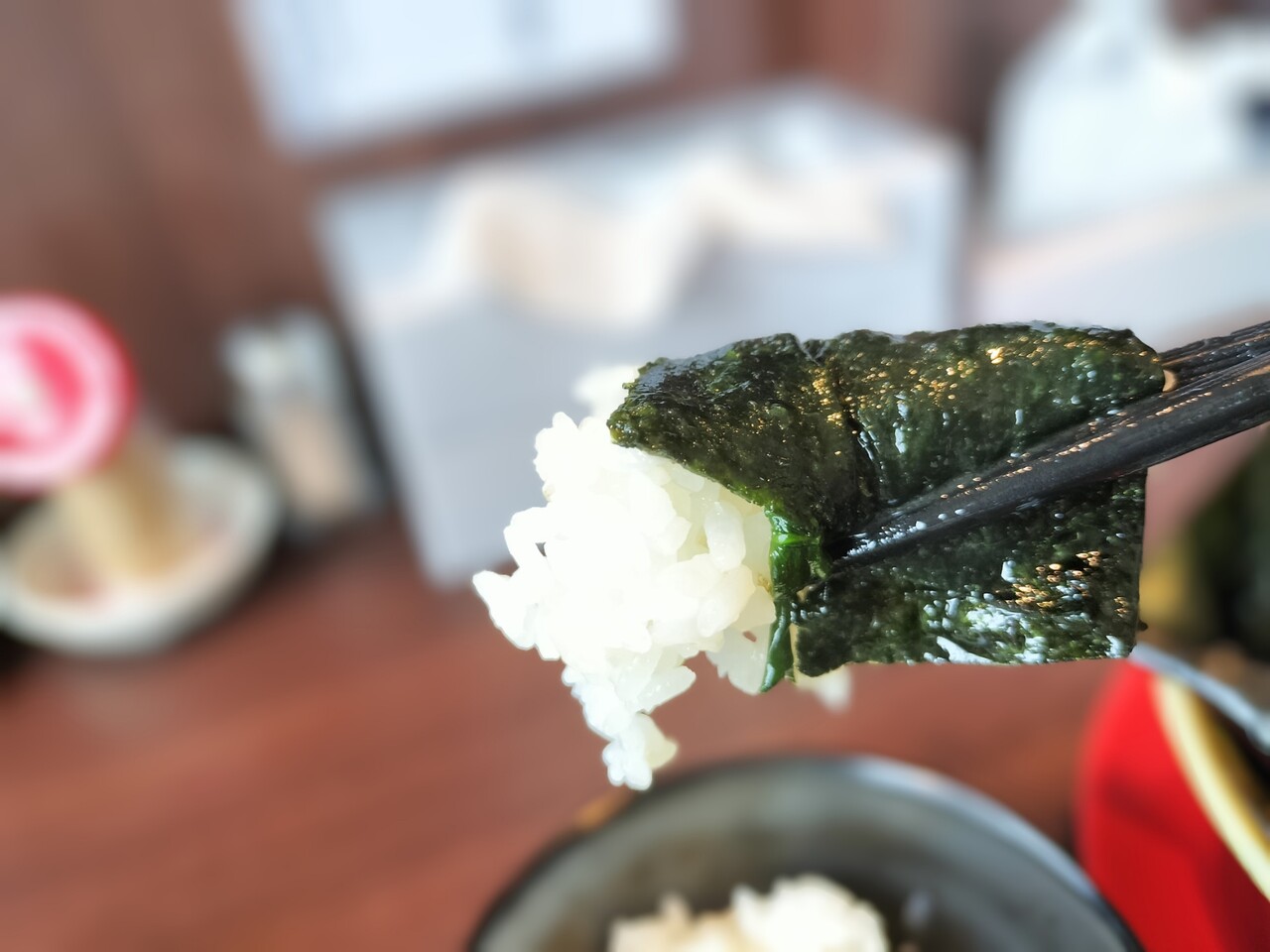 その海苔でライスを巻いて食べると至福の美味しさ!デフォルトで海苔3枚なので 3度至福を味わえます