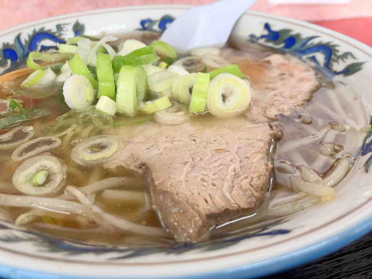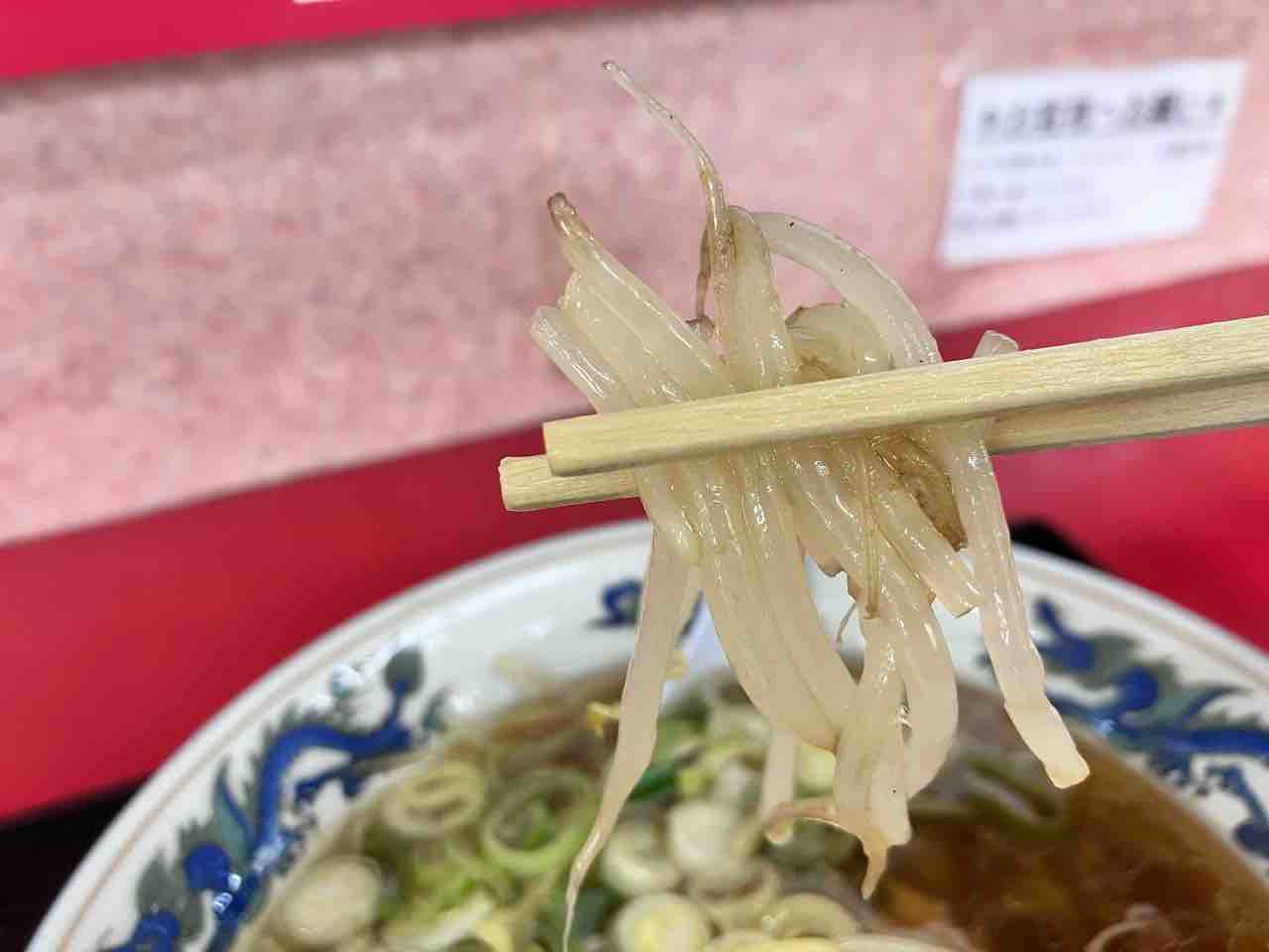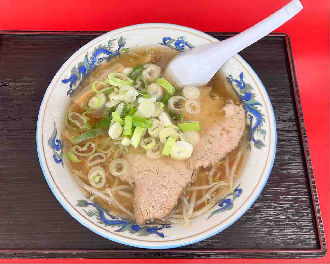 長ネギ、メンマ、チャーシュー、もやしのシンプルな表面がラードに覆われたシンプルなラーメン