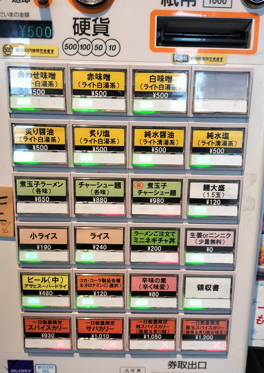 メニューはこちらで 今回は 炙り醤油(ライト白湯系)(¥500)の食券を購入します