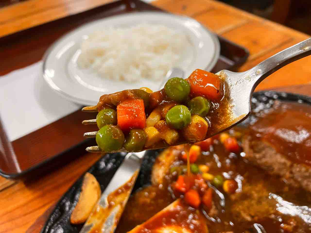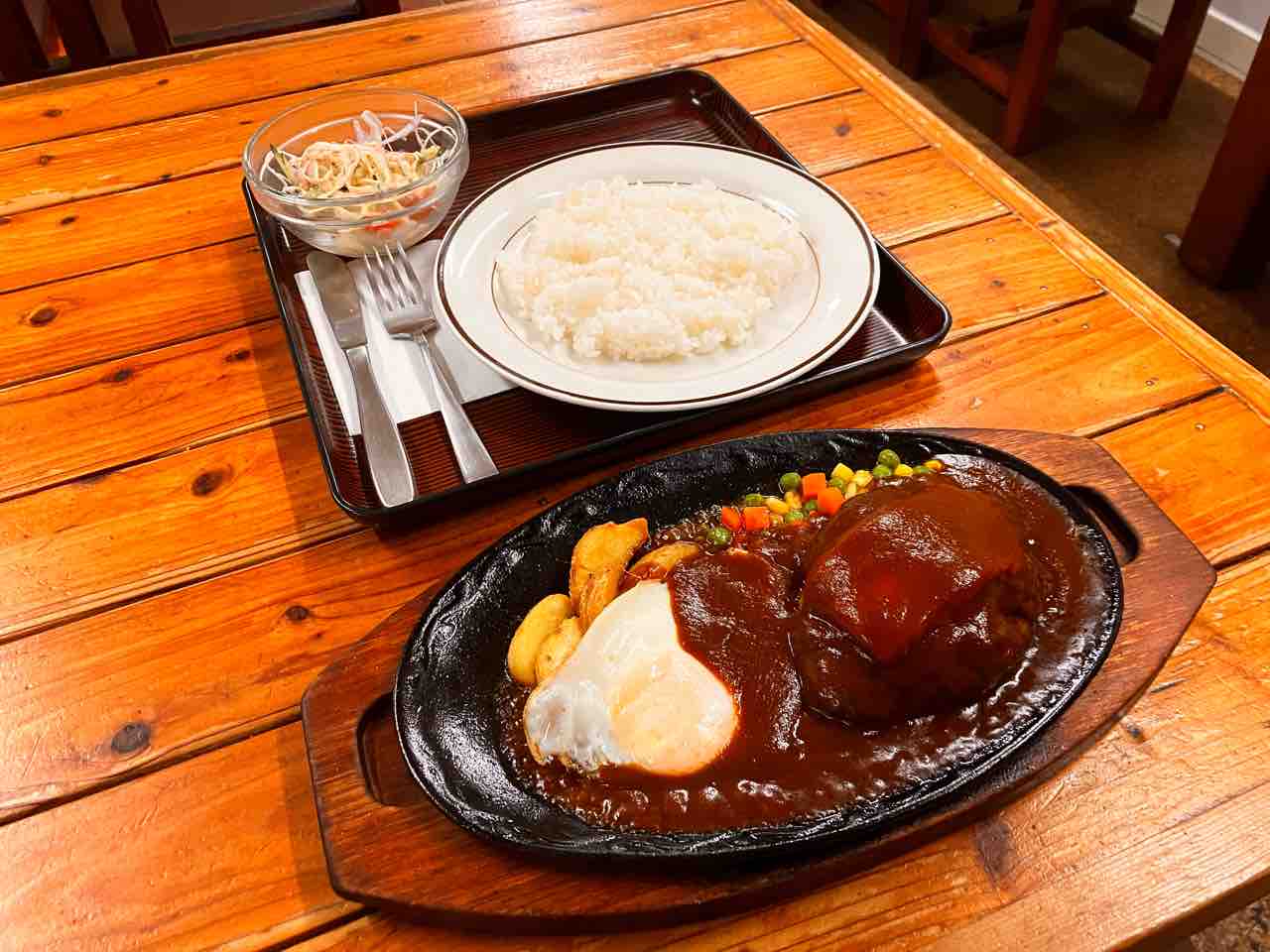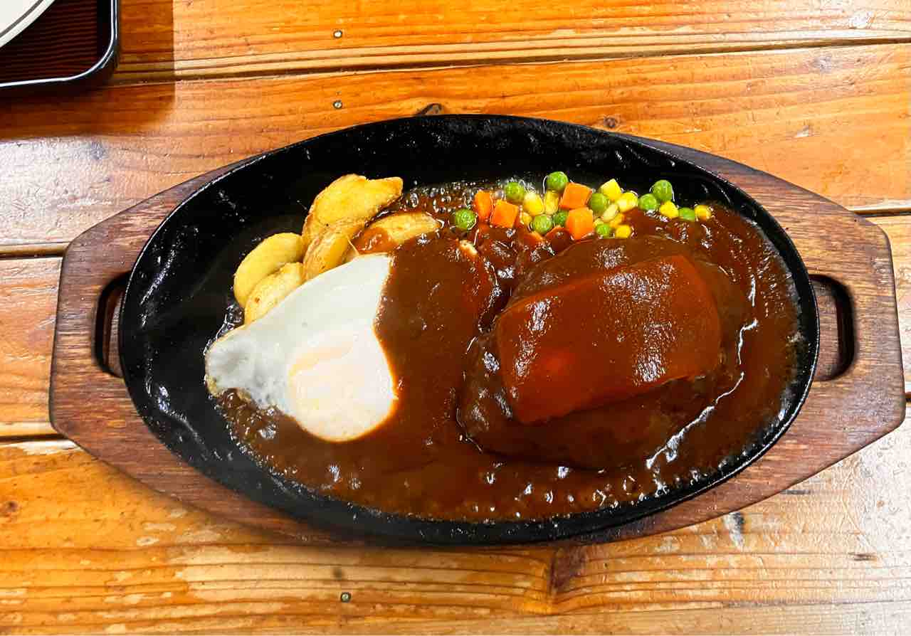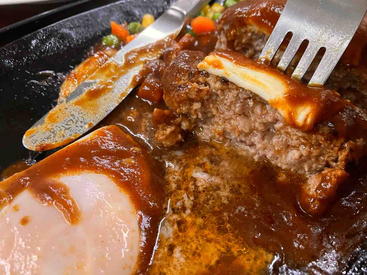 そして鉄板の上でグツグツと音を立てるハンバーグにフライドポテト、目玉焼き、ミックス野菜。視覚、嗅覚、聴覚にせめてくるね