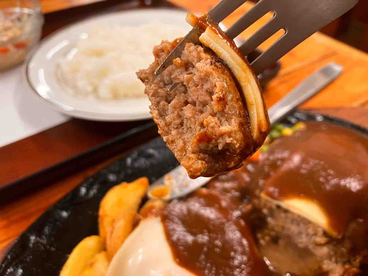 ハンバーグをカットすると表面にはチーズが乗っておりチーズとハンバーグの二層になっておりまして食べるとハンバーグの肉汁がジュワッと溢れて デミグラスソースとチーズとも相まってバリバリ美味い!