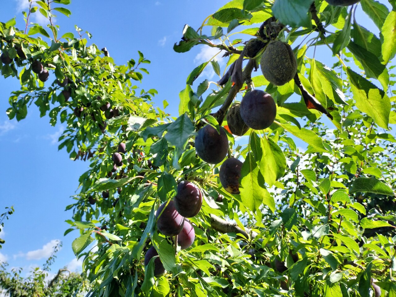 品種はよく分からないけど木に沢山のプルーンが実っており