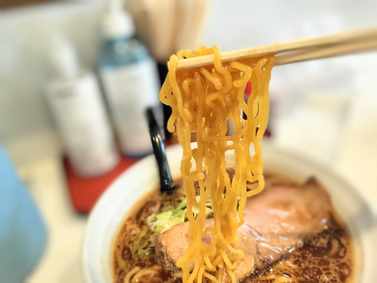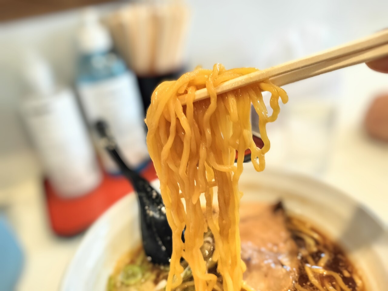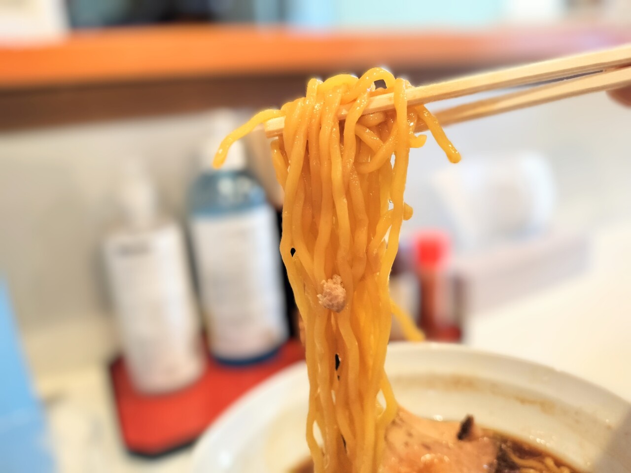 麺は黄色麺の中細縮れ麺でスープがよく絡み こちらも美味しく頂けます