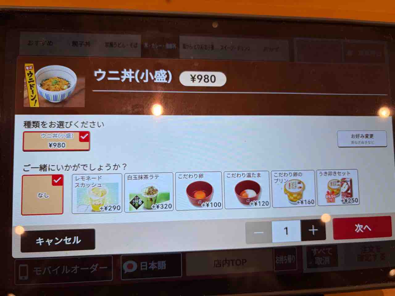 タッチパネルでオーダーしようとすると ありました! ウニ丼! 今回はウニ丼(小盛)こちらをオーダーするのと