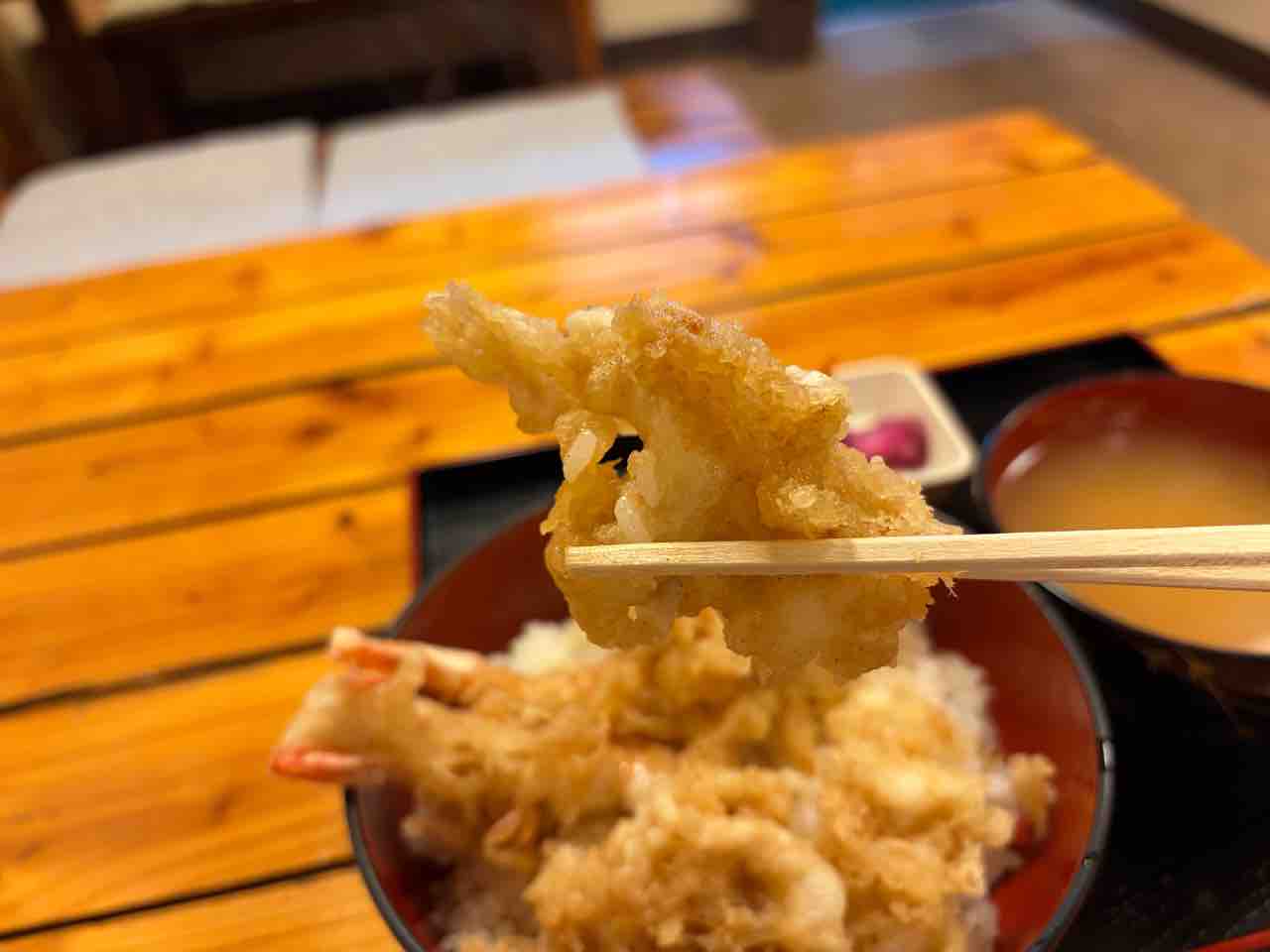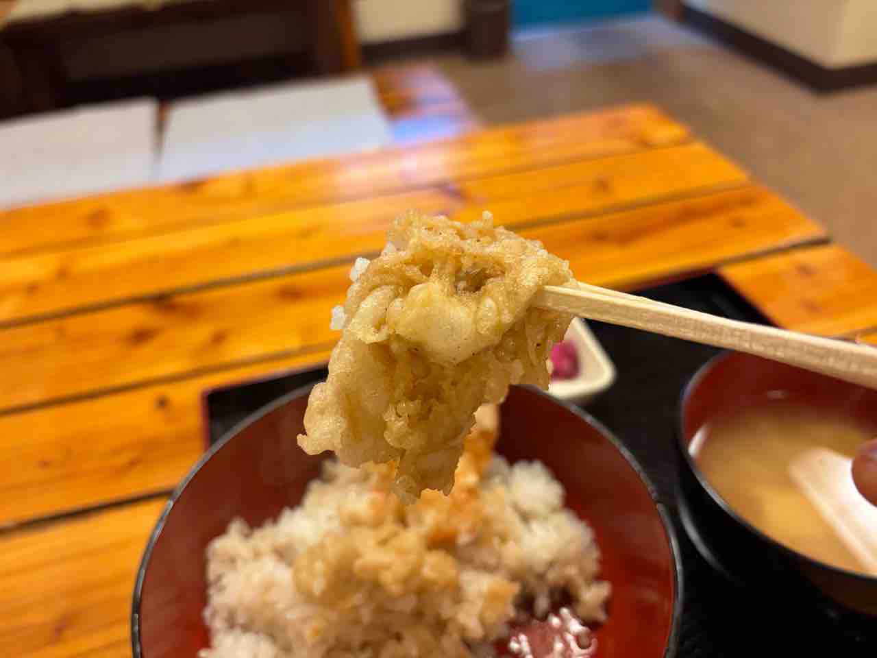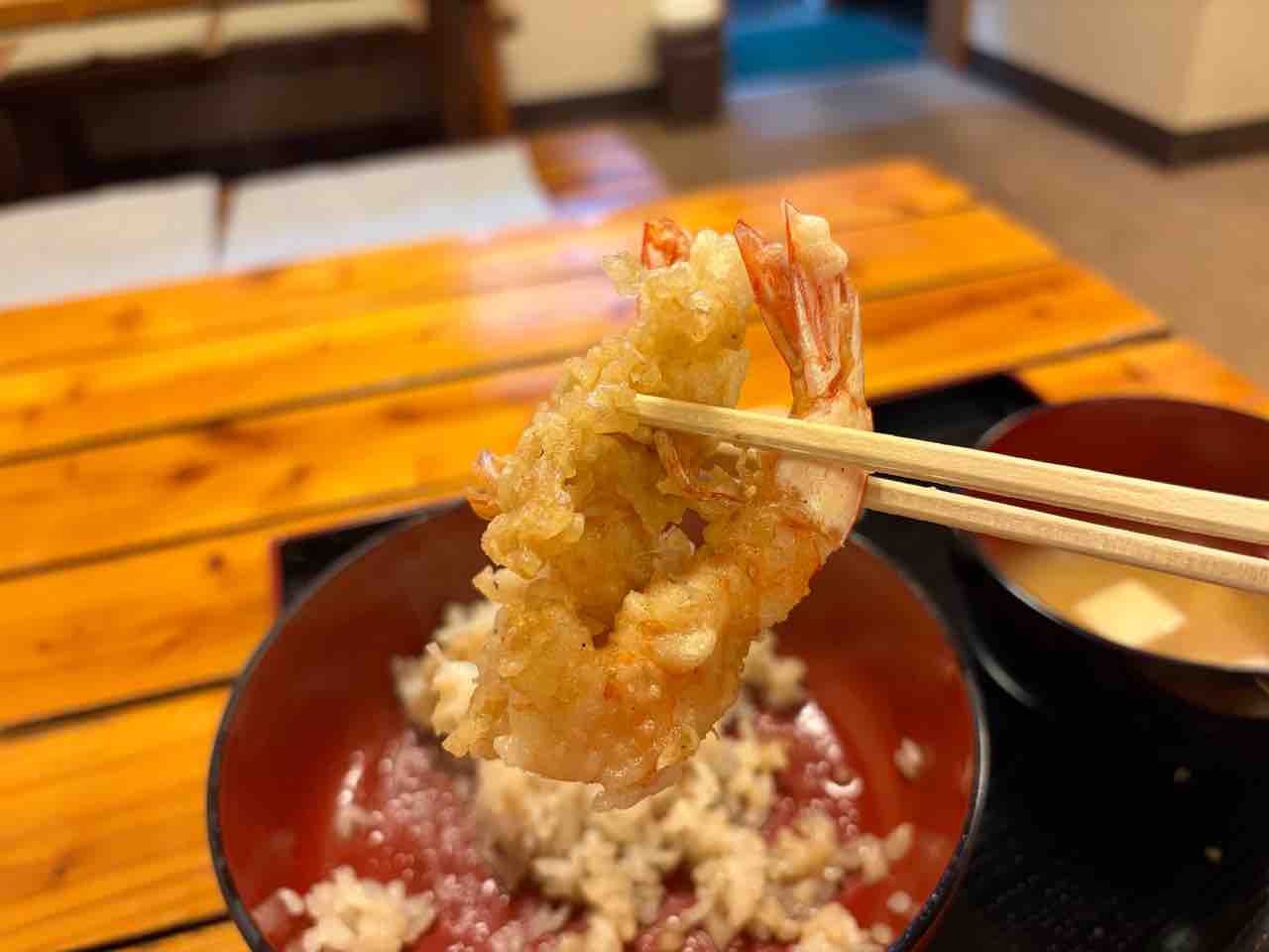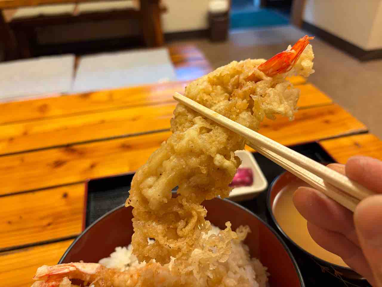 かき揚げなのかなと天ぷらを持つと エビ2本が合わさったエビの天ぷらで