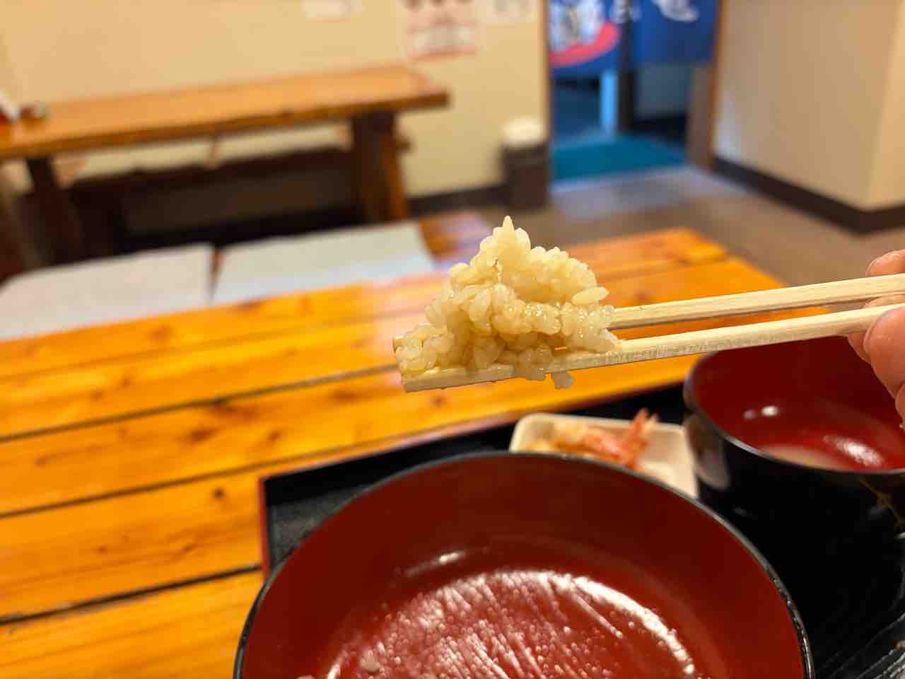 ご飯も天丼の甘いタレが染みており美味しく頂けます。お米は国産使用と店内の壁に貼ってありました
