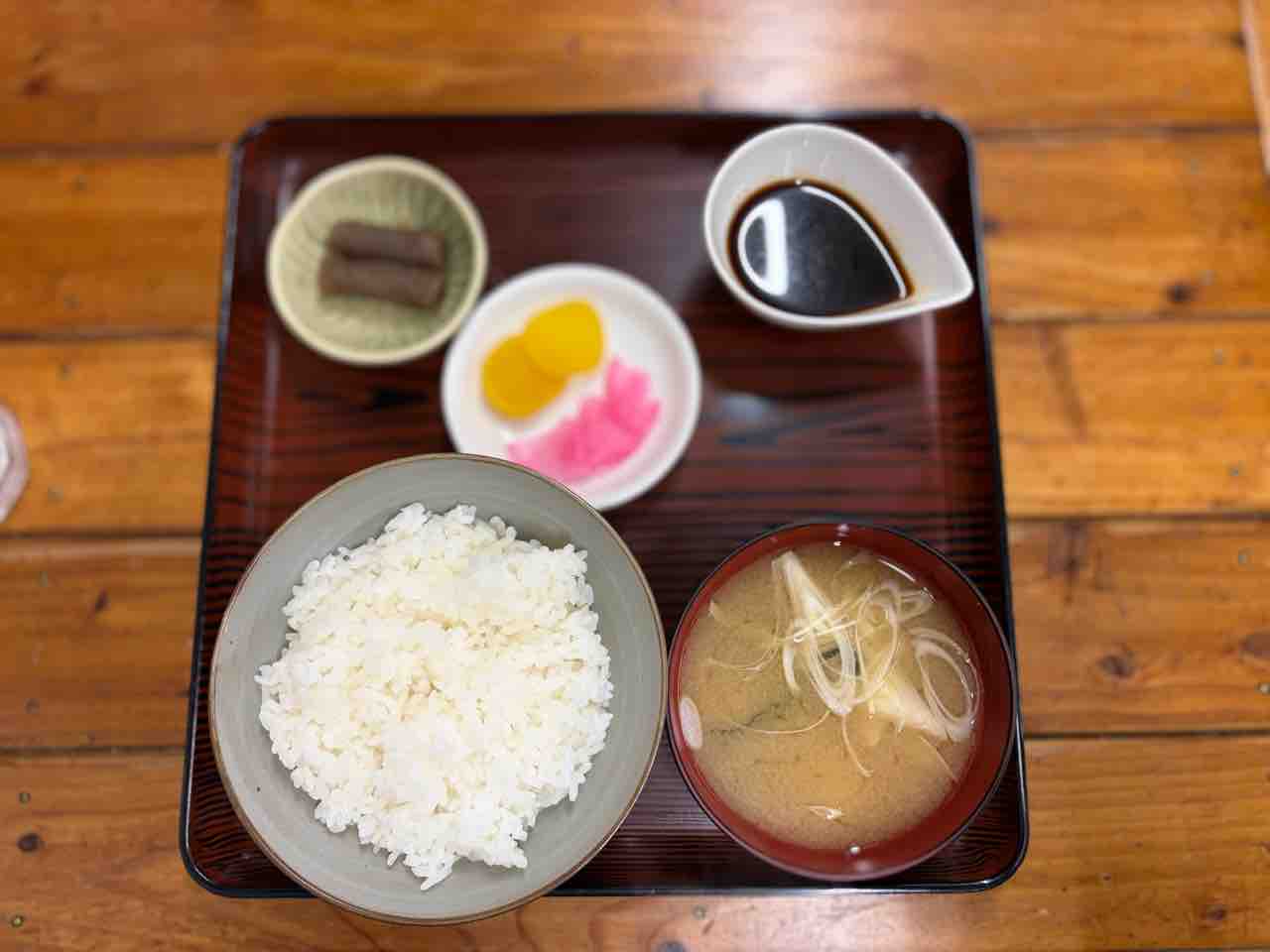 そうして約10分ほど待っていると ご飯、味噌汁、漬物、小鉢、ジンギスカンのタレが乗ったトレーが運ばれてきました