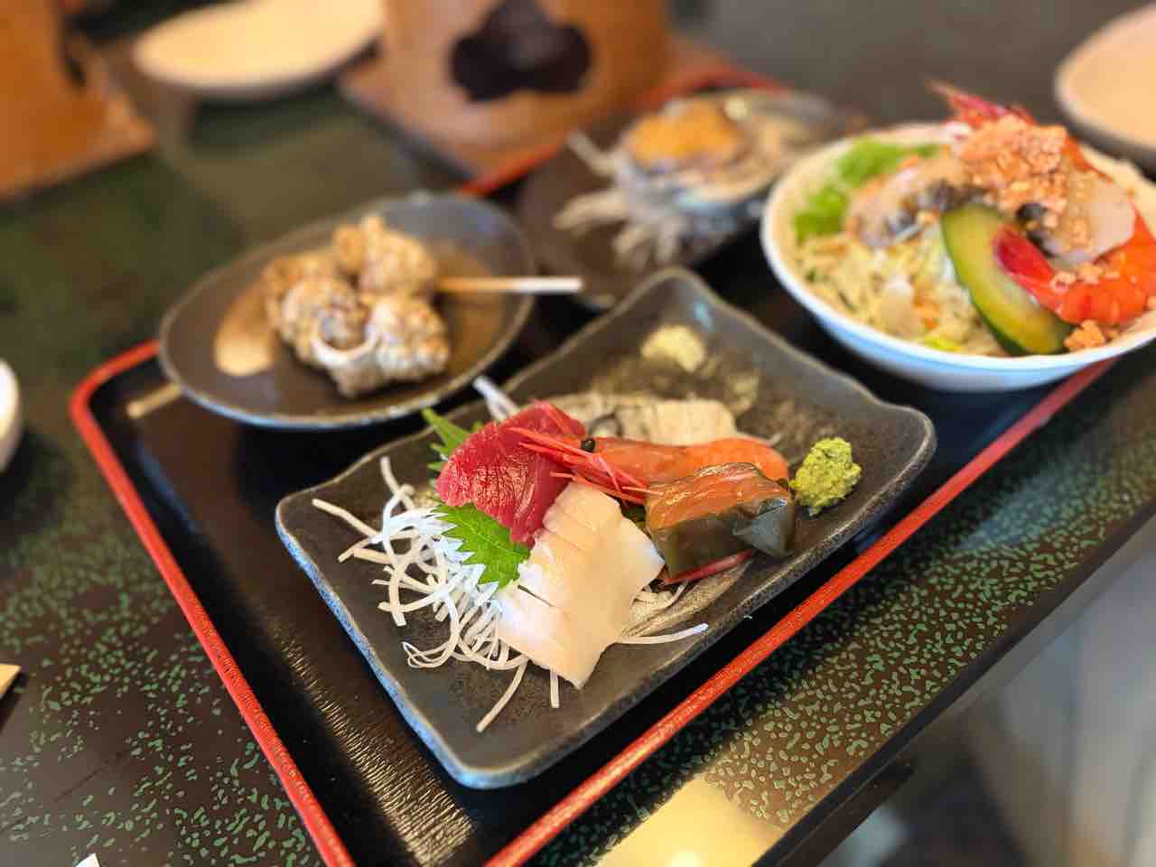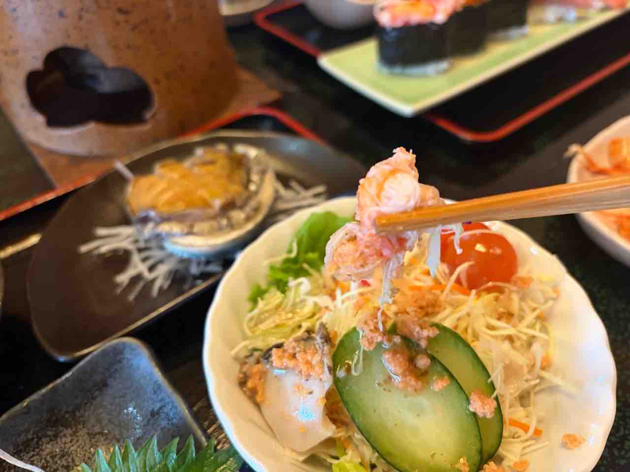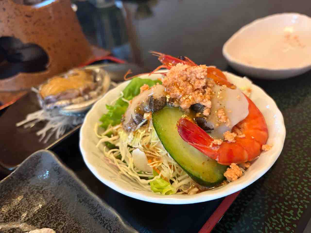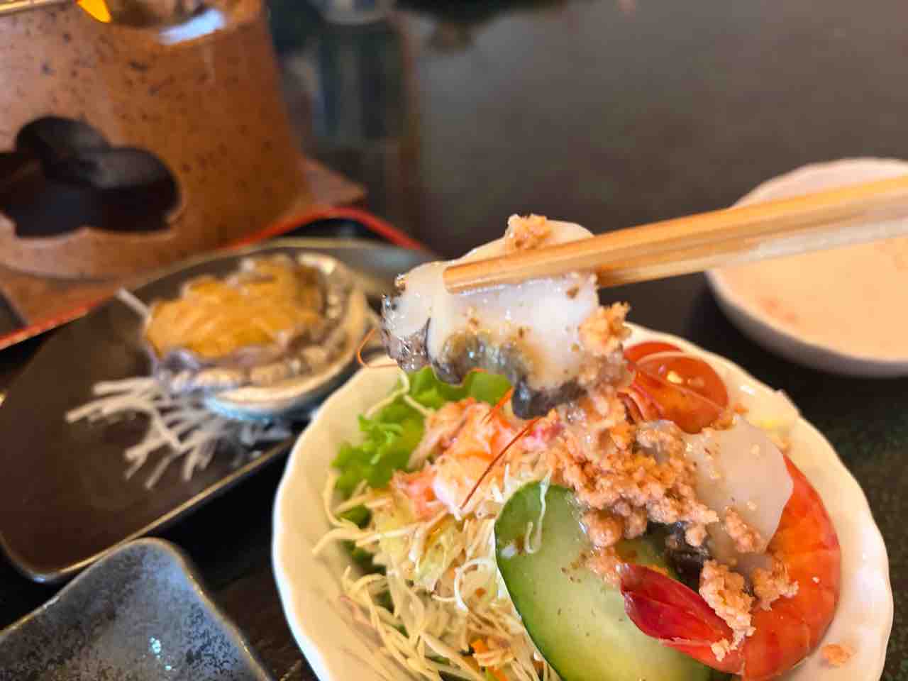 次は海鮮サラダ!鮑にちょいとウニ乗せて食べる!豪華〜