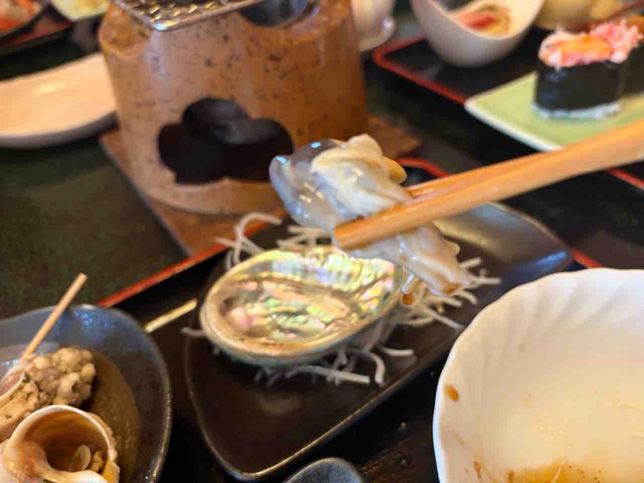 焼き、生、寿司と鮑を色々食べられて、寿司に刺身にデザートも付いてるんだからバラエティ豊富でボリュームもある