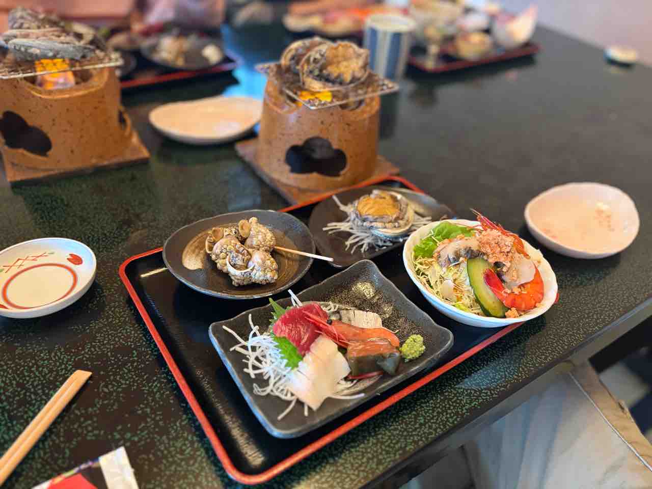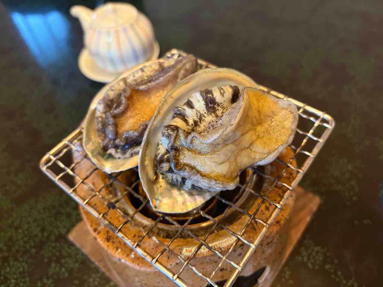 直ぐに鮑の踊り焼きセットが運ばれてきました。固形燃料に着火されると鮑がウネウネと踊りだすんです