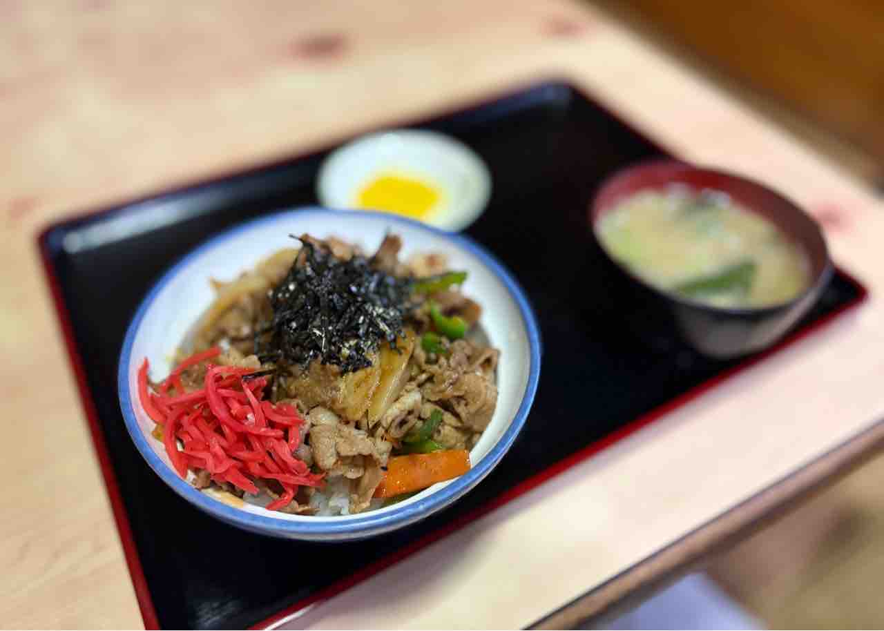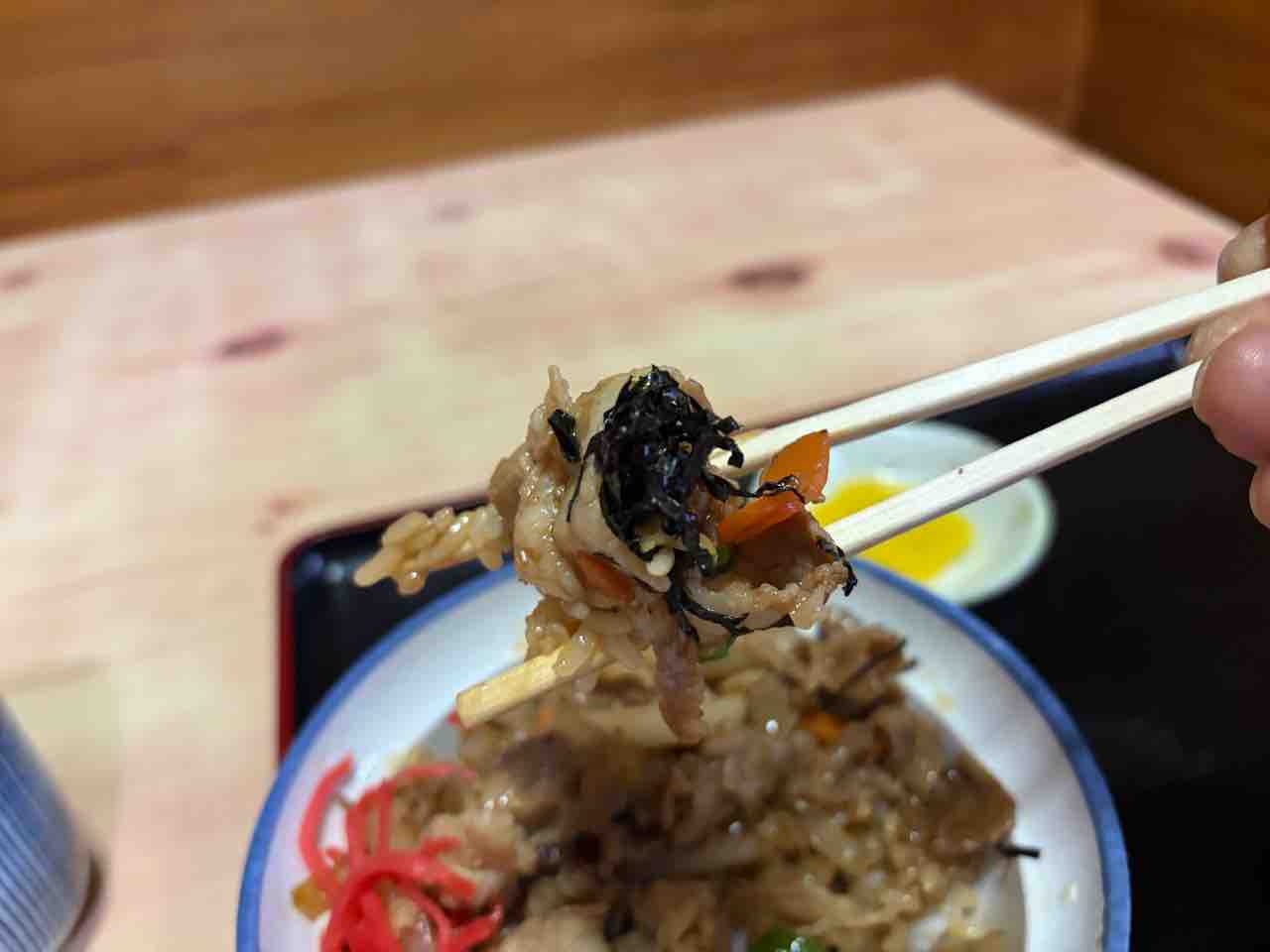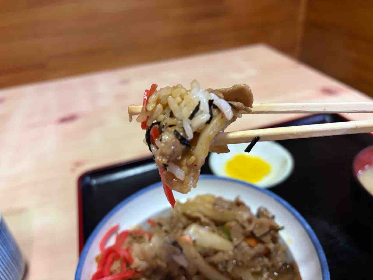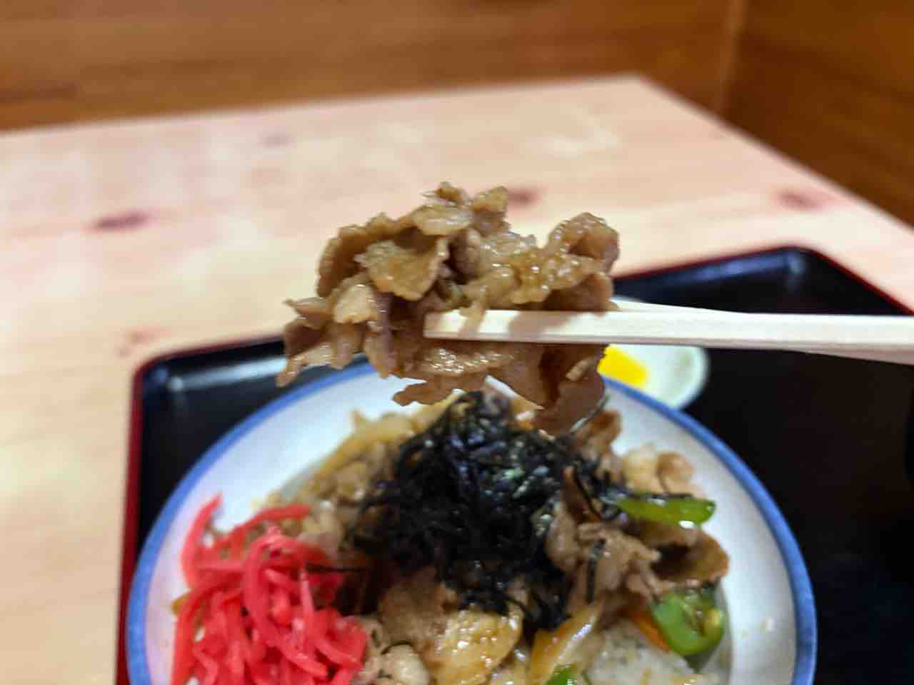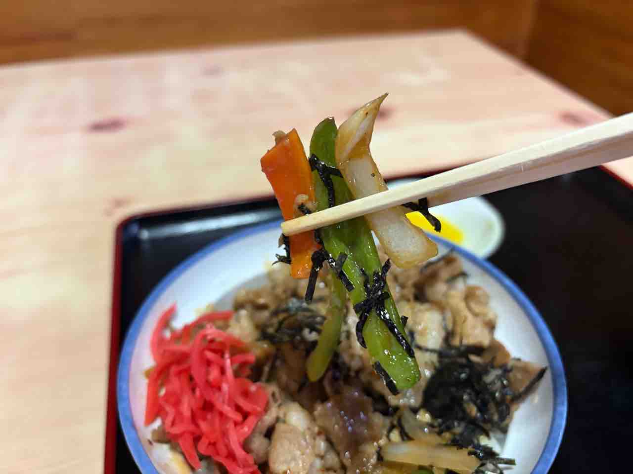 焼肉丼(肉、ピーマン、玉ねぎ、人参、海苔、紅生姜)は結構な盛りです