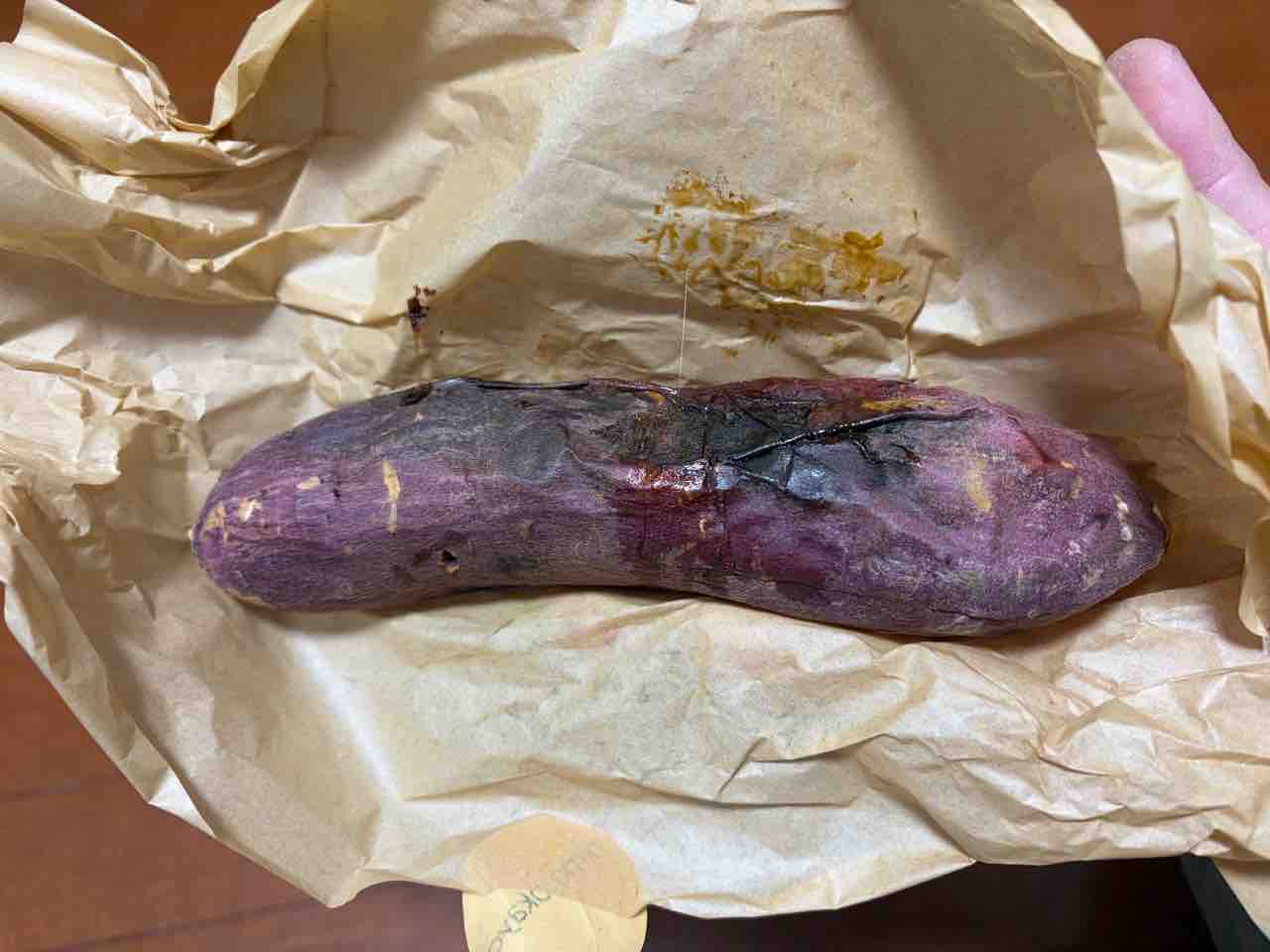包装紙オープン!結構大きめサイズのさつまいもで いい感じの焼き目も入ってる!