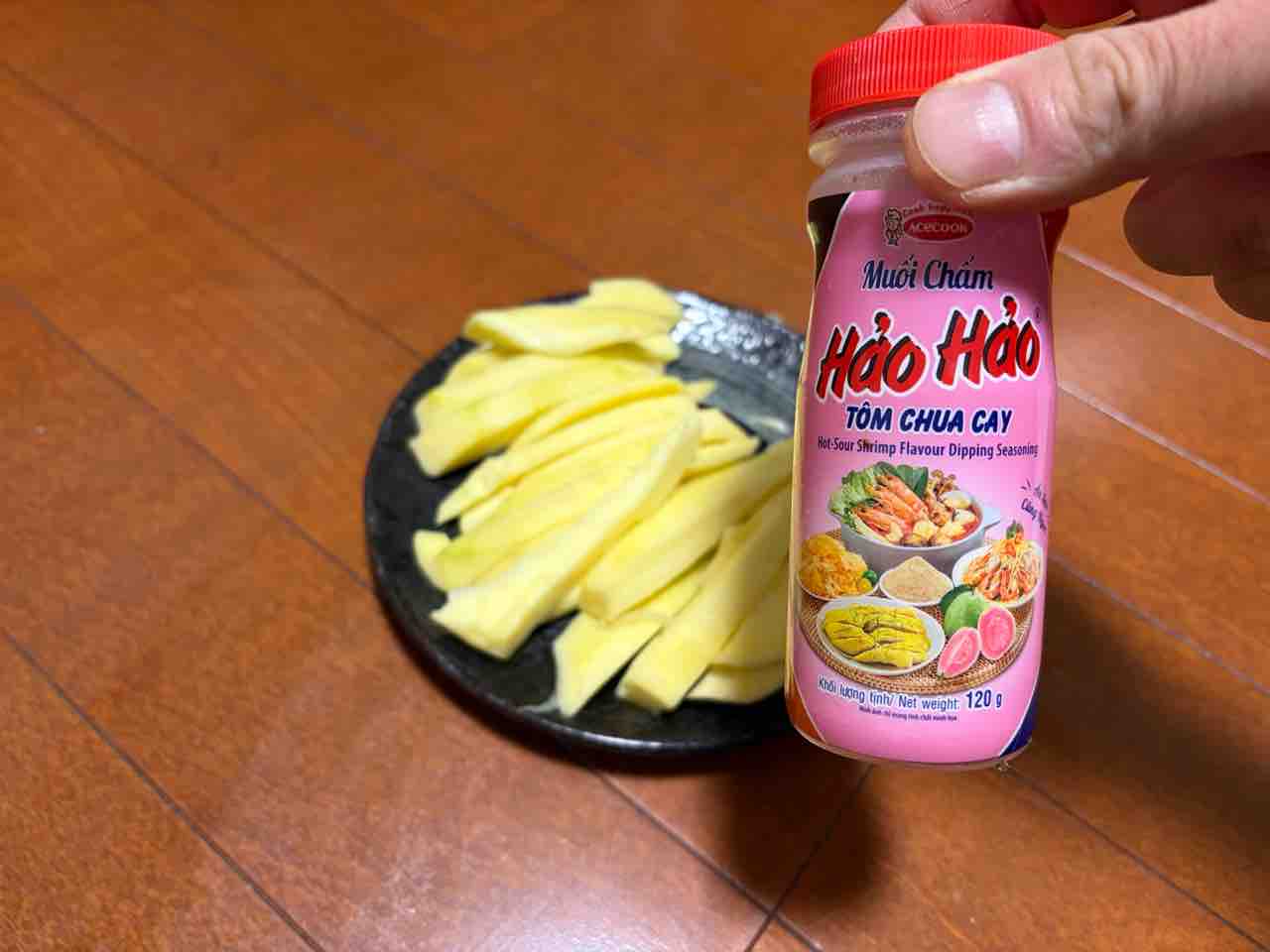 8月にベトナムに遊びにいったのですが グリーンマンゴーに ハオハオって言うエビ塩(Muối ớt Hảo Hảo)振って食べると甘みが増して美味しいよって教えてもらって現地で食べてみて美味しかったので…