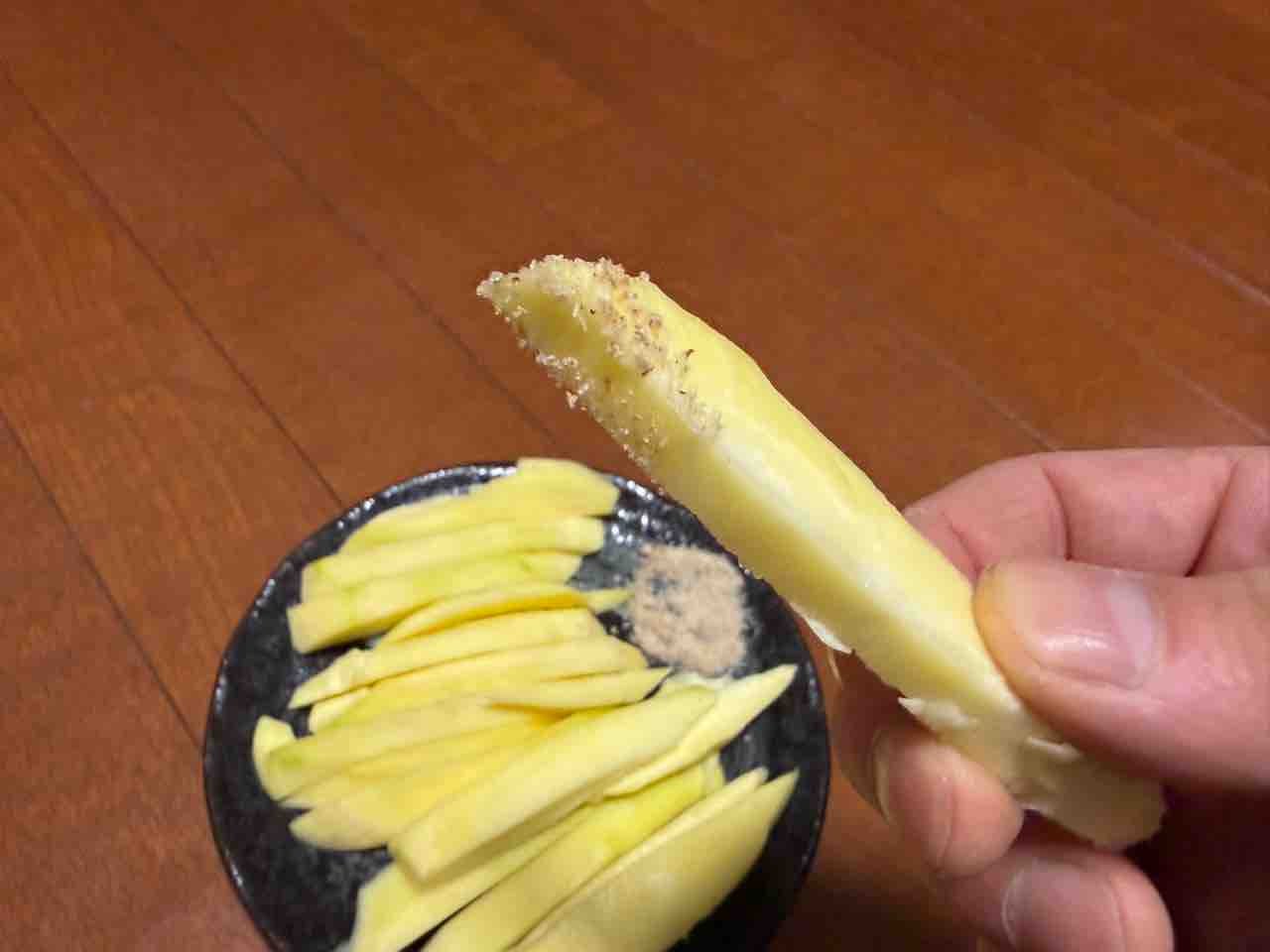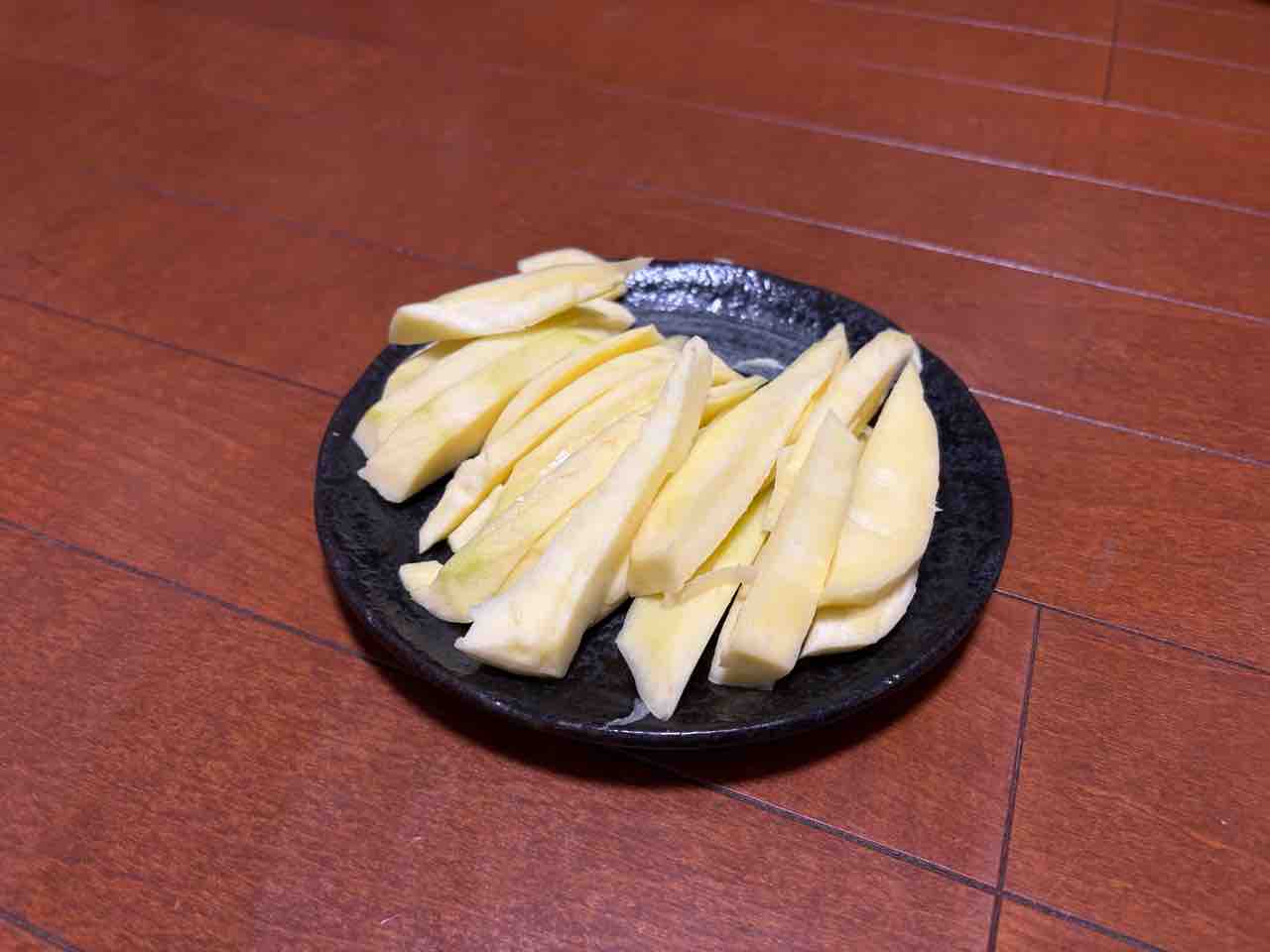 強めの酸味と で引き立つ甘さが堪らんねぇ。半分食べたところで飽きてしまったので残りは細くカットしてサラダに混ぜて食べたいと思います