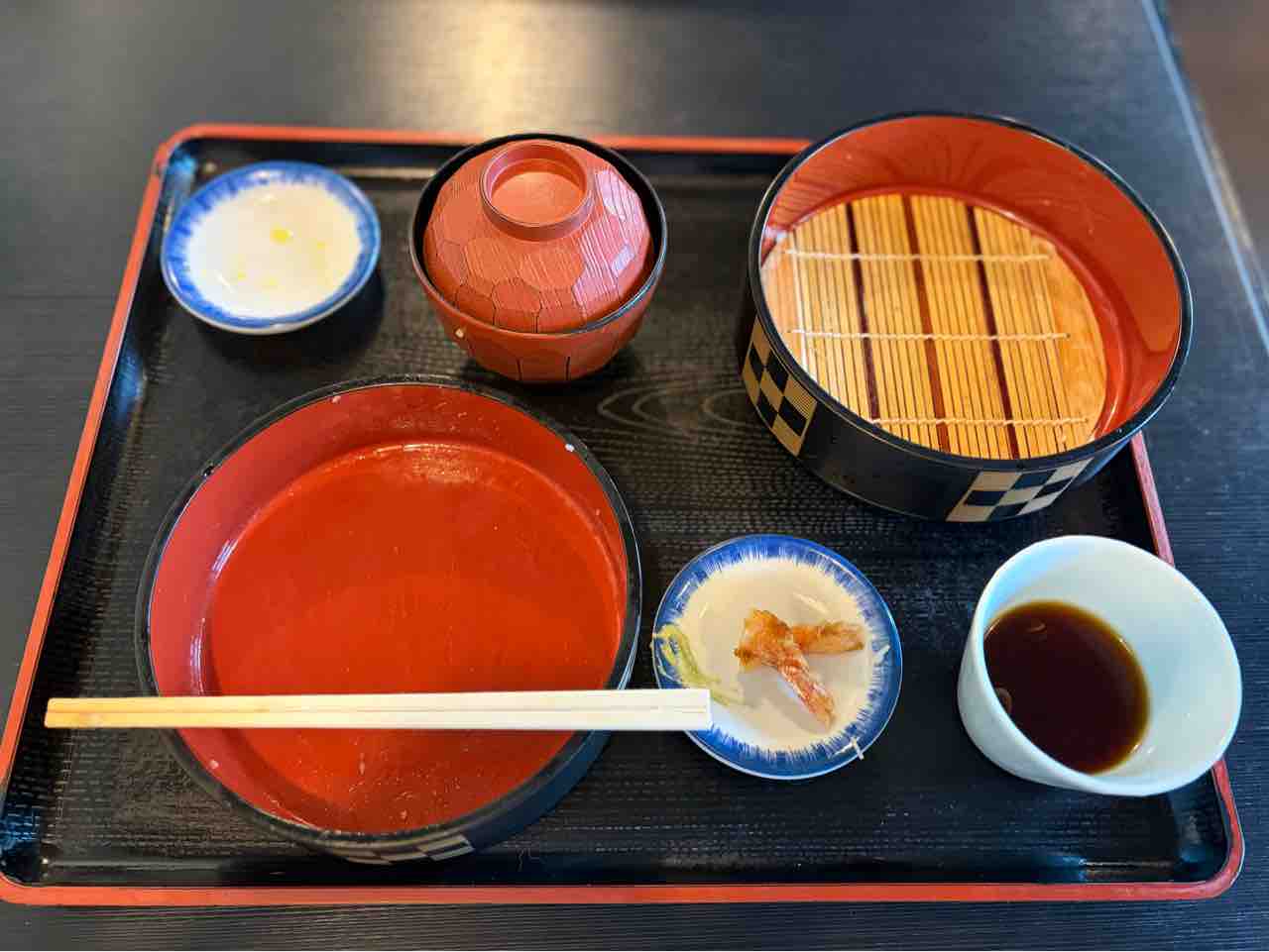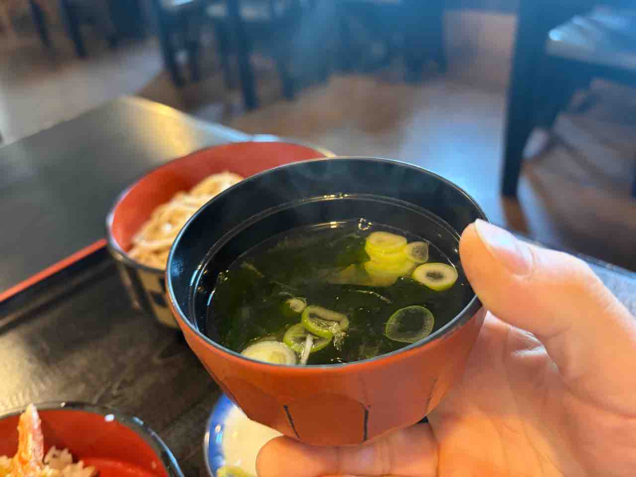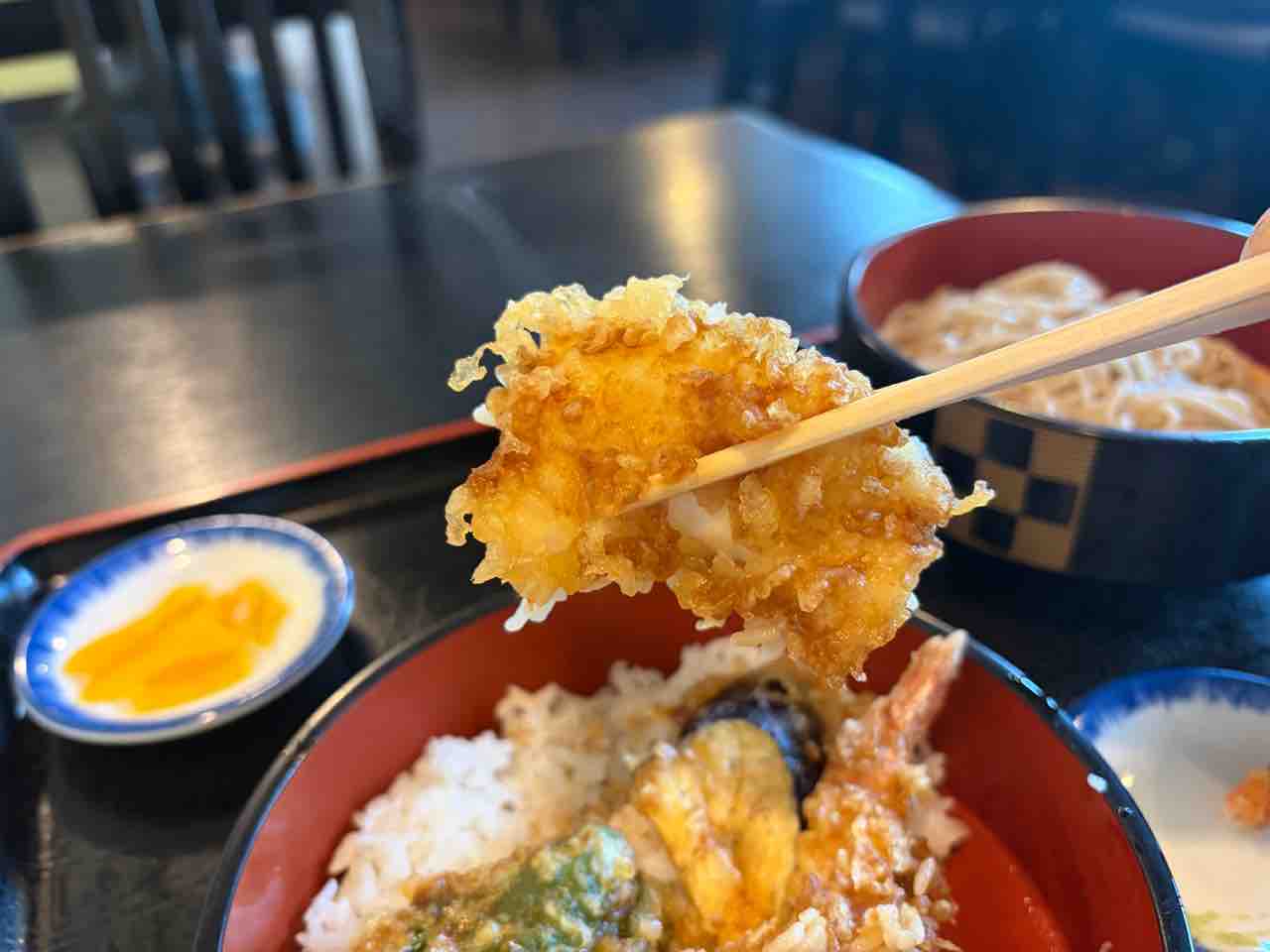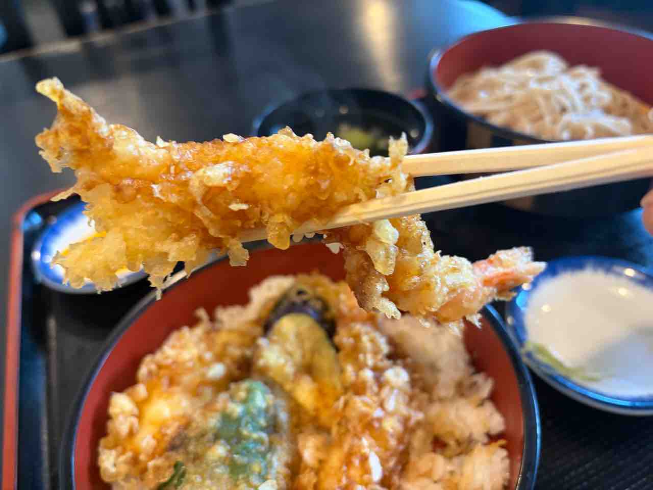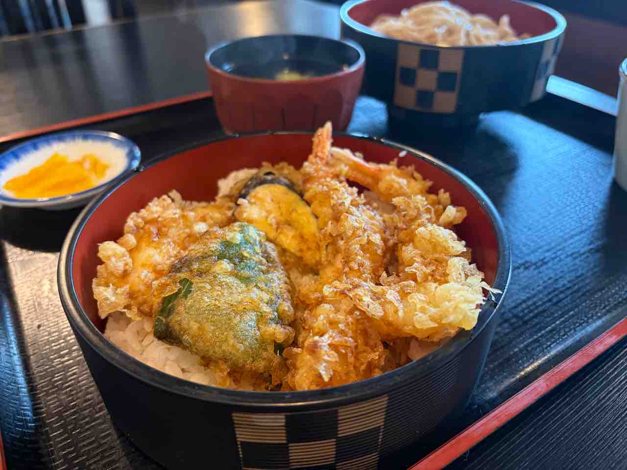 天丼にフルサイズの蕎麦や味噌汁何か付いて¥1,250はリーズナブルかつボリュームあって嬉しいね