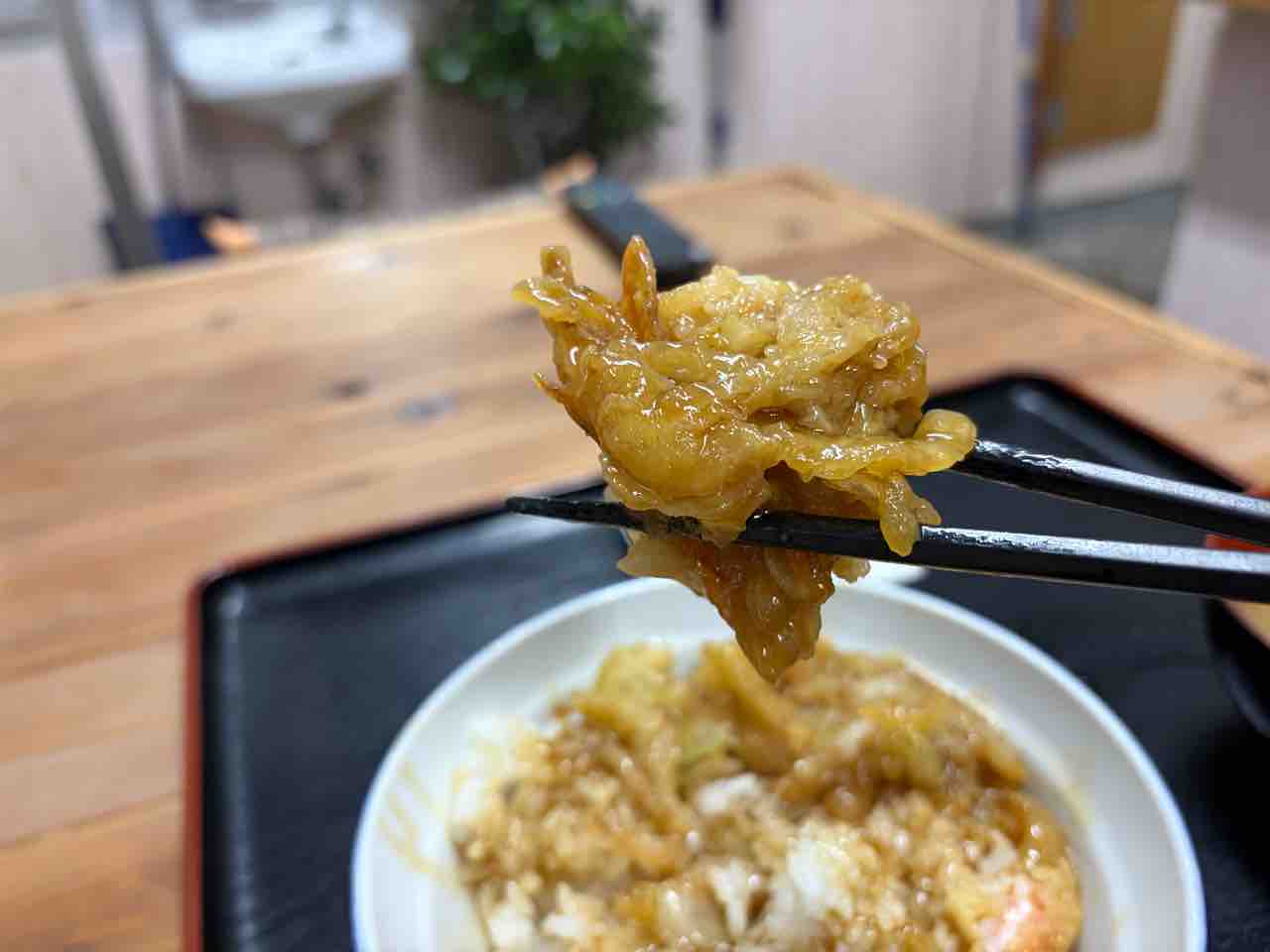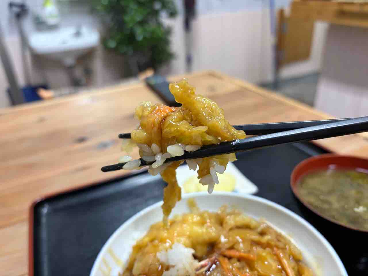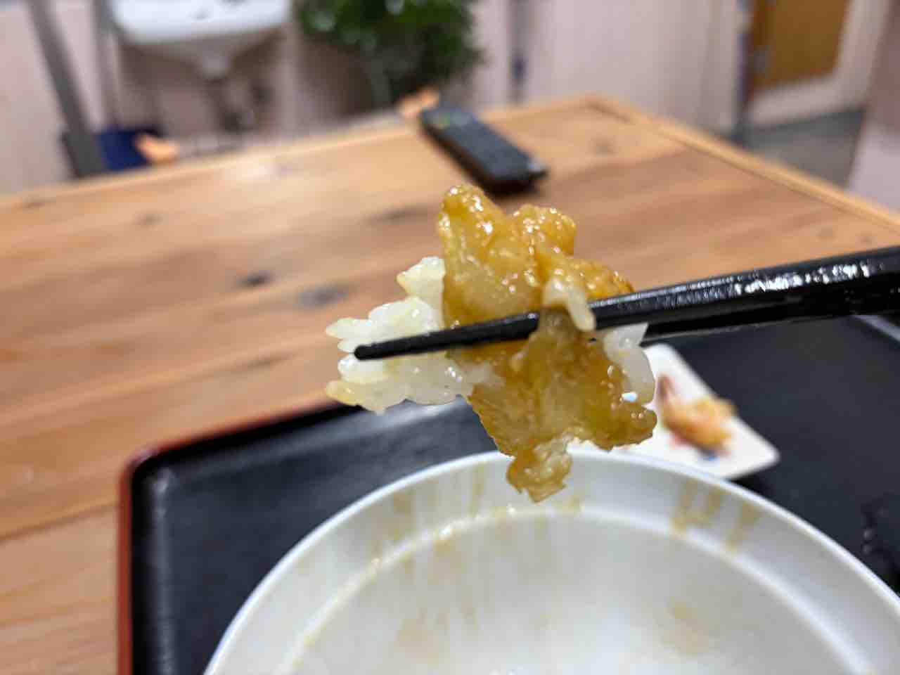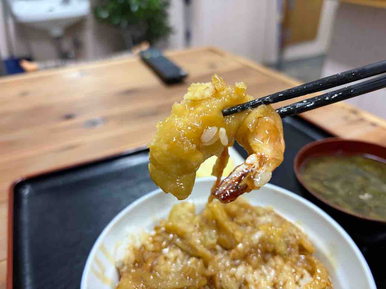 エビ天もパクっと食べると小さいながらもプリっとした食感で悪くない。でもご飯が結構盛られているので これは少し嬉しいね
