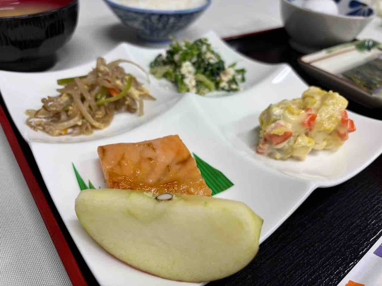他の料理は サツマイモのポテトサラダ、焼き魚(ハラス部分)、豆腐と葉物の和物、野菜炒め(ピーマン、もやし、椎茸 他)、リンゴ