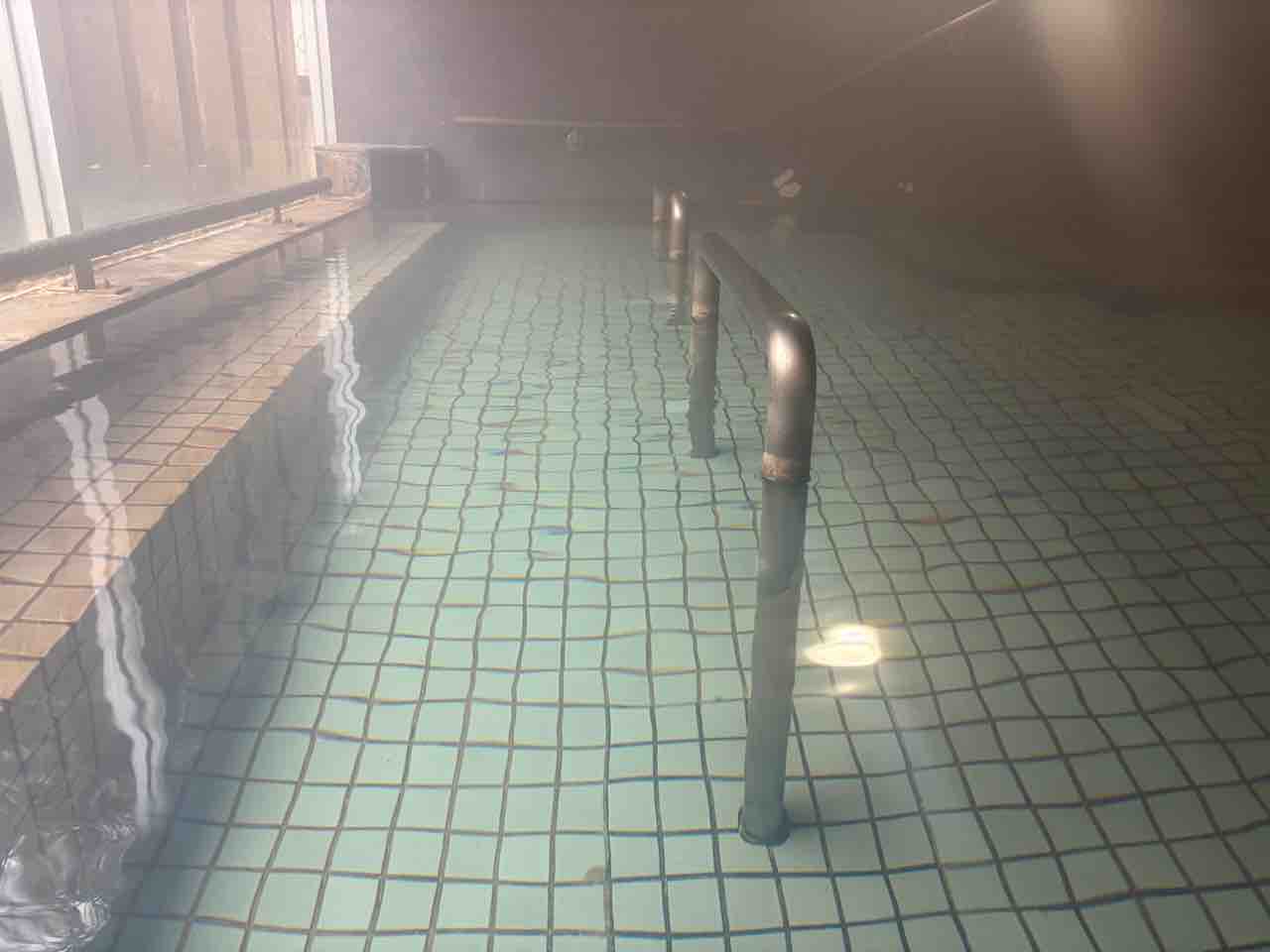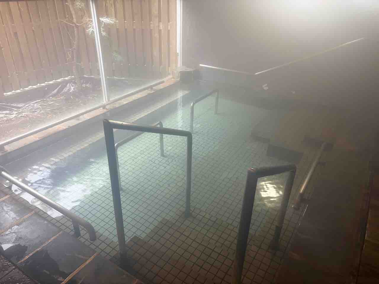奥には浴槽があり源泉掛け流しの湯となっております。ちなみにこの温泉誰も入っていない時間が長いと 40℃台後半の熱々湯を堪能することができるんです。私は水を入れてかき混ぜて45℃くらいに冷ましてから入りますけど笑