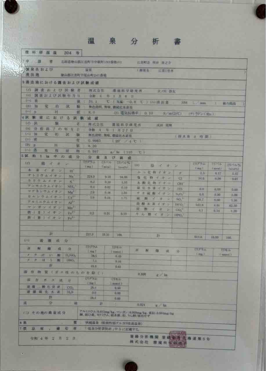 温泉成分分析書 … 弱アルカリ性の低張性高温泉でPH値が8.0と高めなのでスベスベるす湯で炭酸成分も多く含まれたあるので血行が良くなり身体の温まる温泉なんです