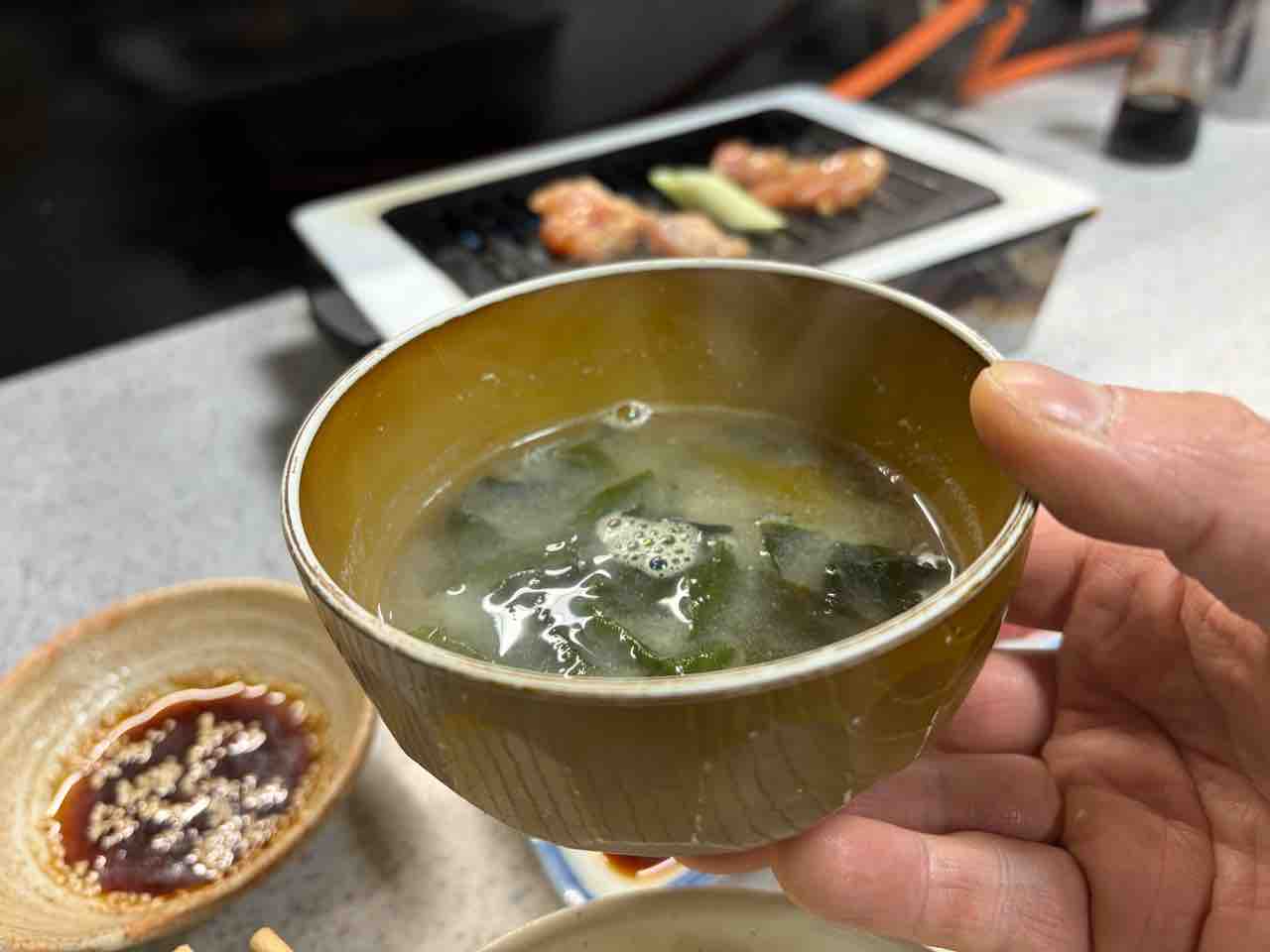 その間に 鮪の刺身とご飯を食べてつつ味噌汁も頂き