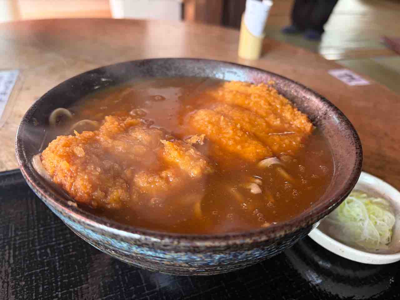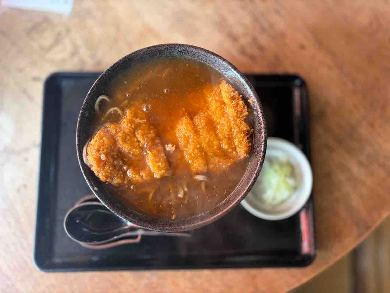 横に長ネギが添えられており以上が カツカレー蕎麦となります