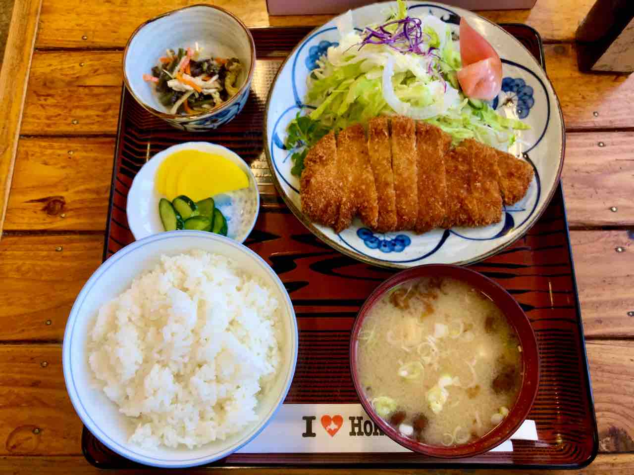 内容は ご飯、豚カツ、お新香、小鉢、味噌汁です。