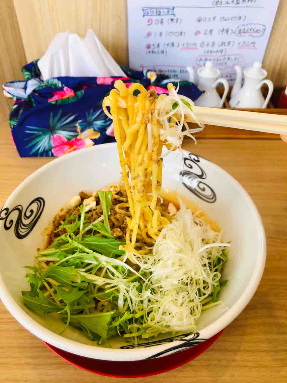汁なし坦々麺の手もみ縮れ麺で辛さは1辛にしました。(800円税込)